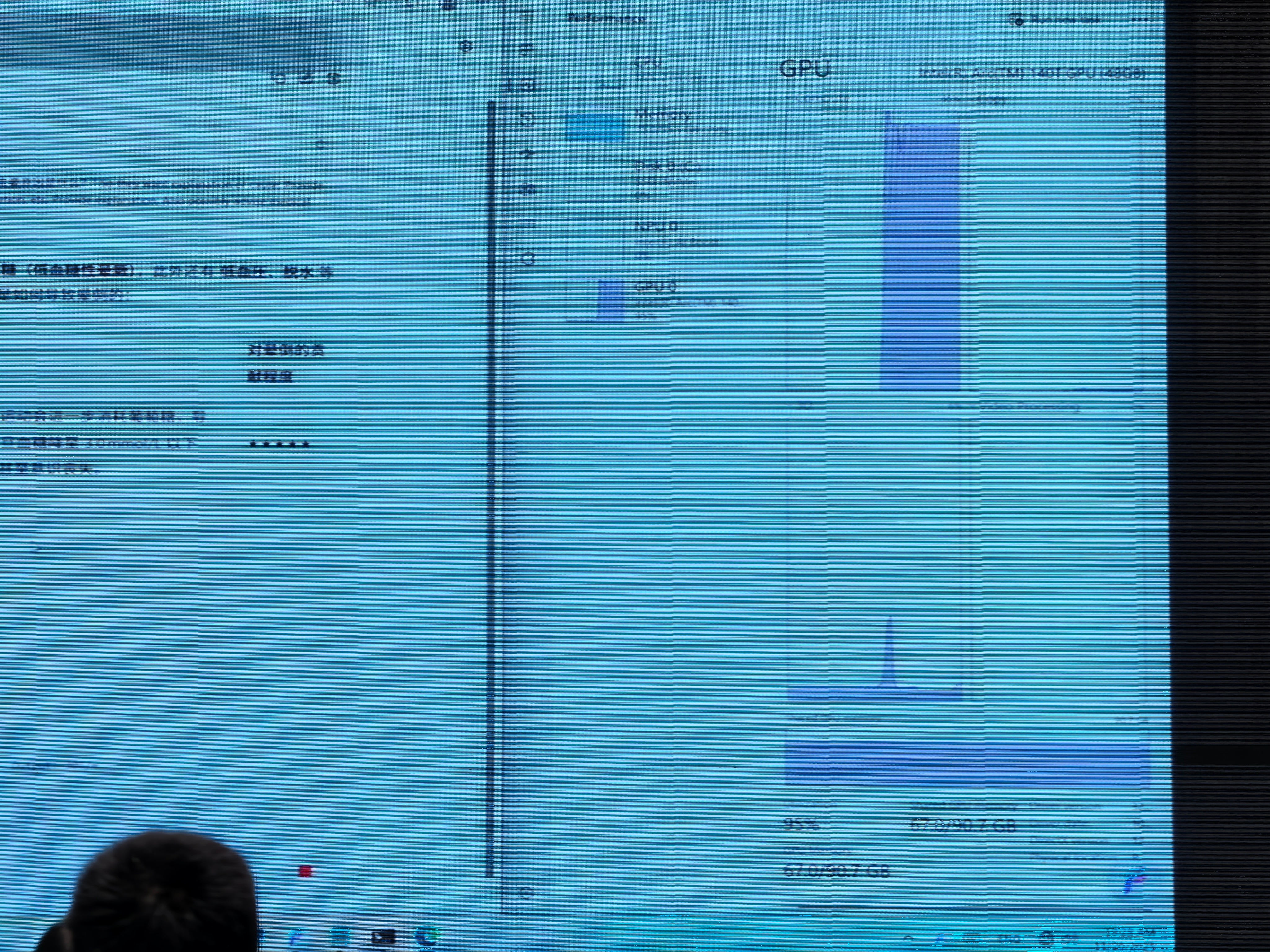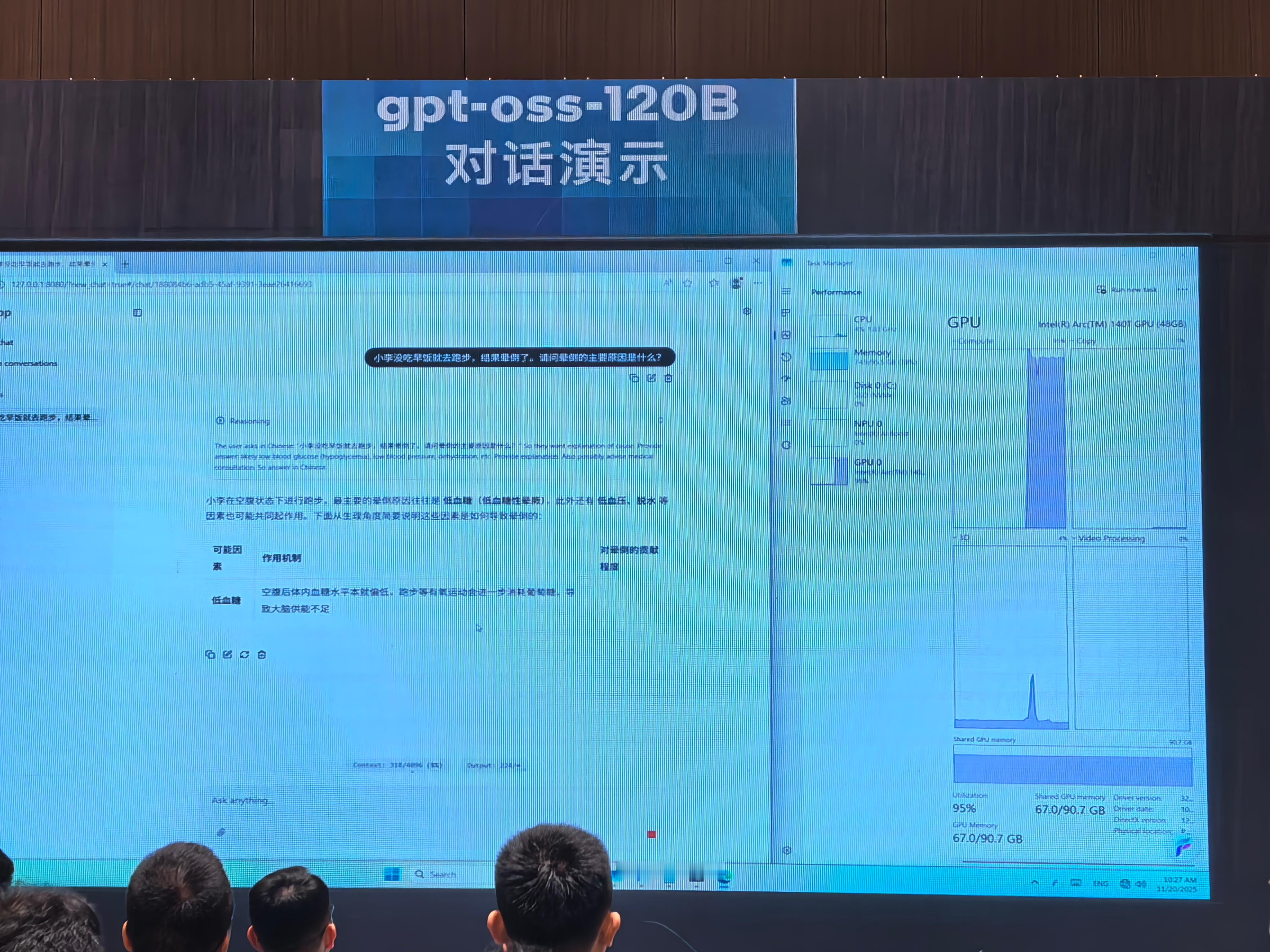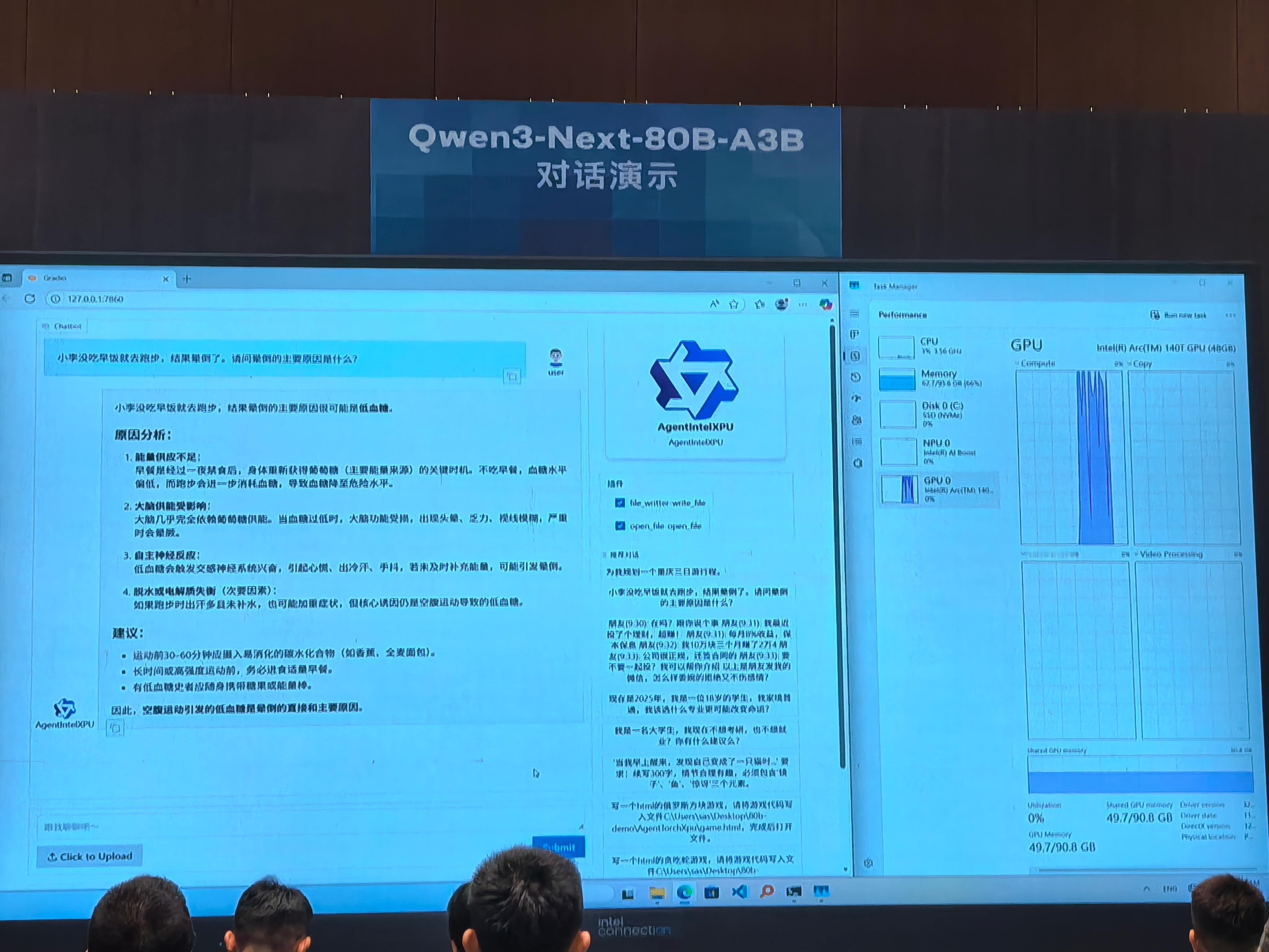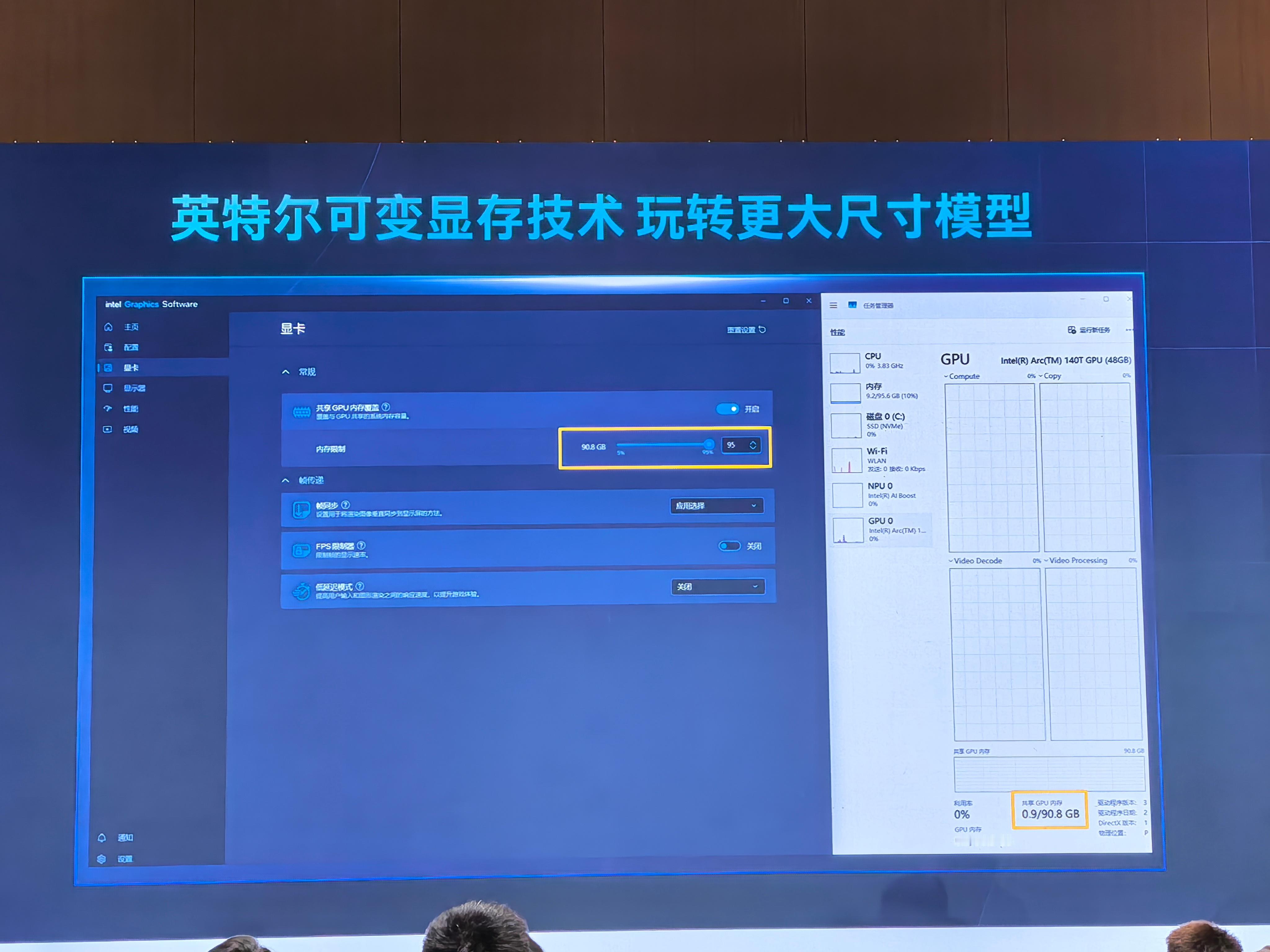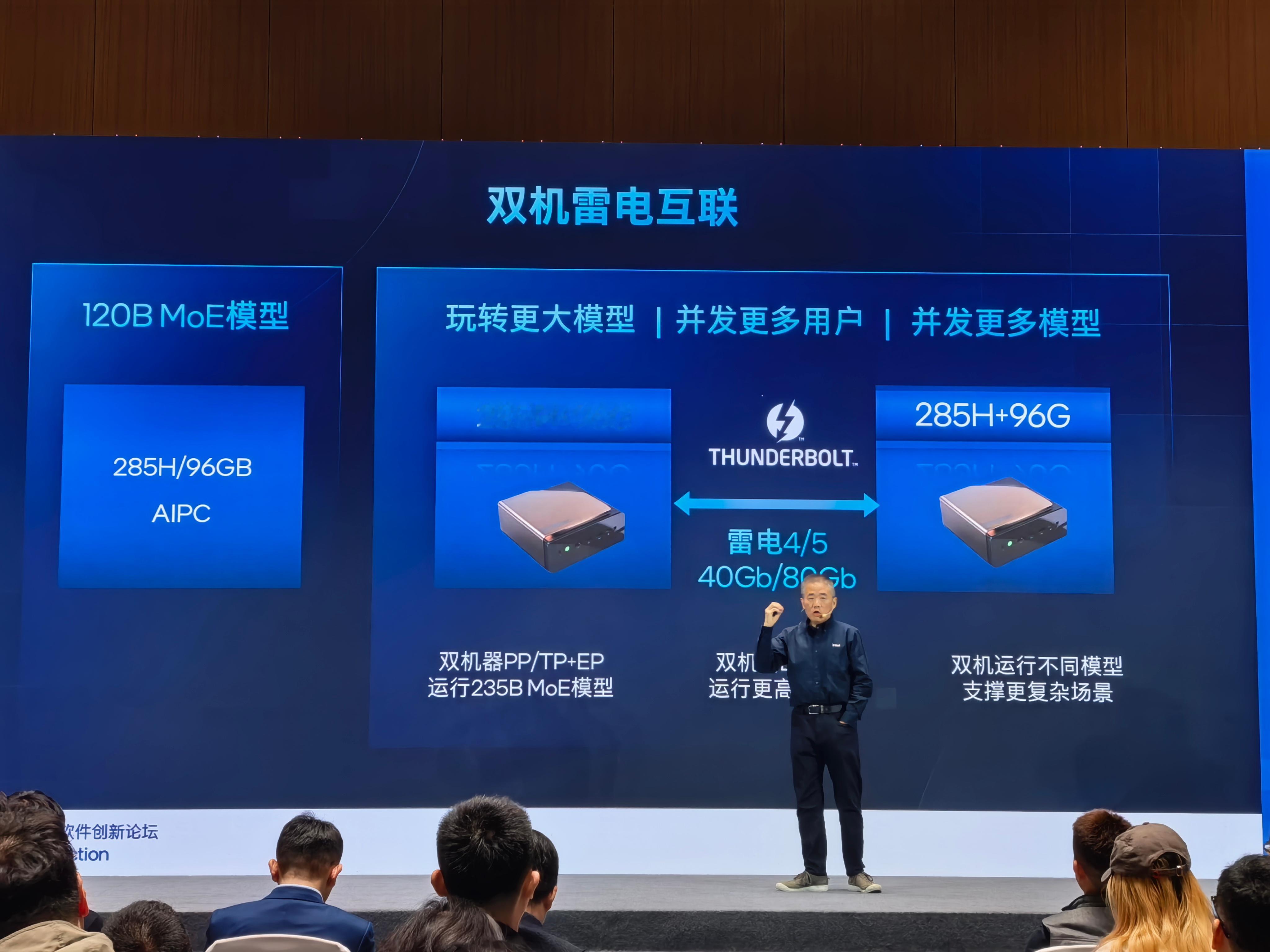 今天在现场看到英特尔带来一整套端侧大模型推理能力的展现:最大支持 128GB 内存、120B 模型加载,真正把“大显身手”落到实处;1、多款迷你主机同步亮相,285H+96GB 组合让口袋大小的机器也能跑大模型;2、可变显存技术直接把 Arc 140V GPU 的显存推到 90GB+,更大 KV Cache、更稳推理;3、现场还展示了 Qwen3-Next-80B-A3B、gpt-oss-120B 的端侧对话,任务管理器里的显存占用体现了可变显存优势。4、双机雷电互联更是绝了,两台迷你机可拼成 235B MoE 模型的“合体形态”;5、与群联合作的 AI SSD也正式亮相,PCIe5.0 拉满,让大模型的上下文、加速效果进一步增强。AIPC 今年真的卷到实处了,从算力、架构到生态都在往“能跑更大模型”的方向全力冲刺。