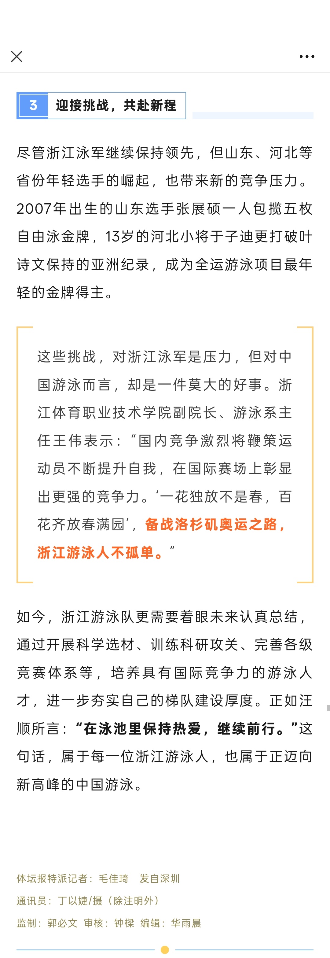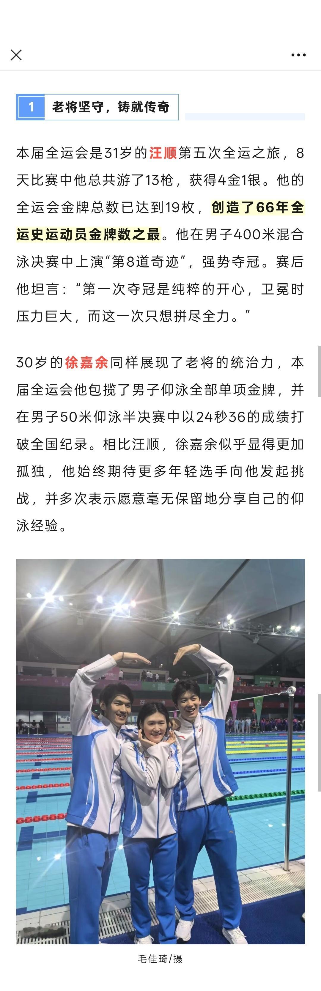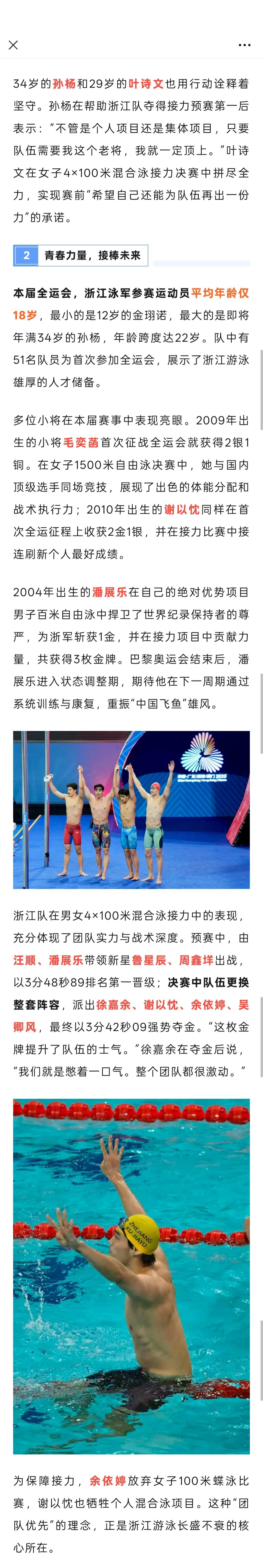 『8352』20251120 深圳十五运会收官报道全运会 | 11金10银9铜收官,浙江泳军继续前行「本届全运会是31岁的汪顺第五次全运之旅,8天比赛中他总共游了13枪,获得4金1银。他的全运会金牌总数已达到19枚,创造了66年全运史运动员金牌数之最。他在男子400米混合泳决赛中上演“第8道奇迹”,强势夺冠。赛后他坦言:“第一次夺冠是纯粹的开心,卫冕时压力巨大,而这一次只想拼尽全力。”」「34岁的孙杨和29岁的叶诗文也用行动诠释着坚守。孙杨在帮助浙江队夺得接力预赛第一后表示:“不管是个人项目还是集体项目,只要队伍需要我这个老将,我就一定顶上。”叶诗文在女子4×100米混合泳接力决赛中拼尽全力,实现赛前“希望自己还能为队伍再出一份力”的承诺。」「浙江队在男女4×100米混合泳接力中的表现,充分体现了团队实力与战术深度。预赛中,由汪顺、潘展乐带领新星鲁星辰、周鑫垟出战,以3分48秒89排名第一晋级;」「如今,浙江游泳队更需要着眼未来认真总结,通过开展科学选材、训练科研攻关、完善各级竞赛体系等,培养具有国际竞争力的游泳人才,进一步夯实自己的梯队建设厚度。正如汪顺所言:“在泳池里保持热爱,继续前行。”这句话,属于每一位浙江游泳人,也属于正迈向新高峰的中国游泳。」cr浙江体育