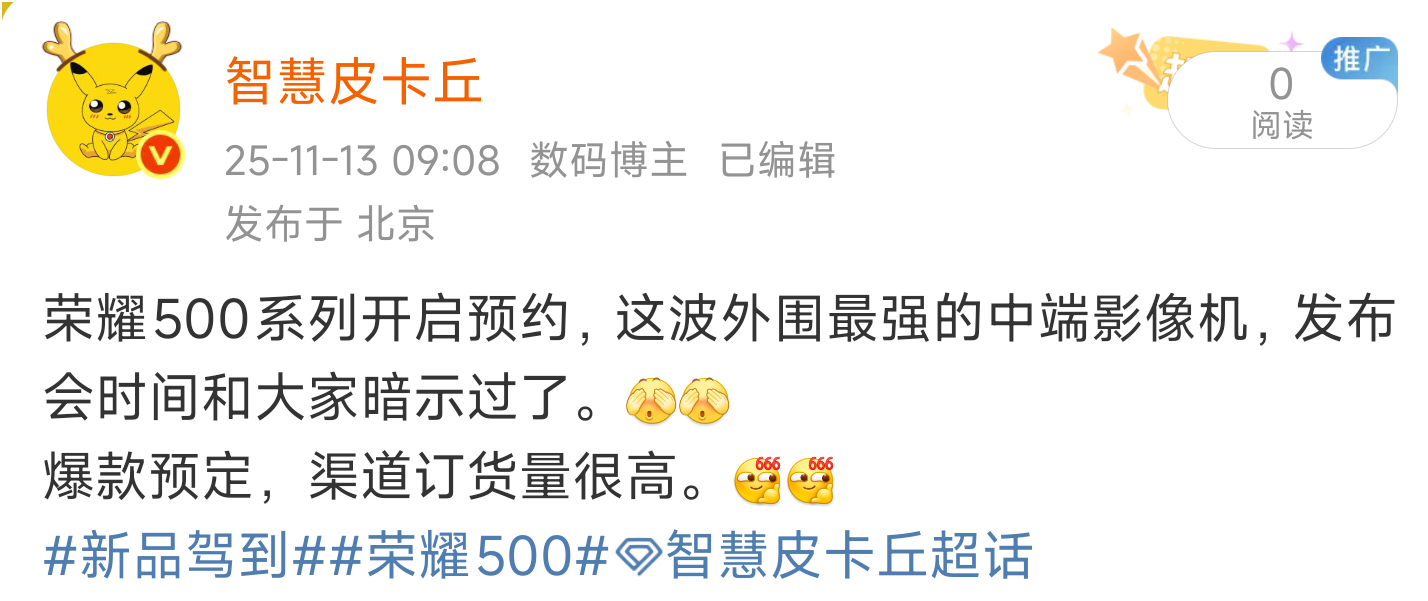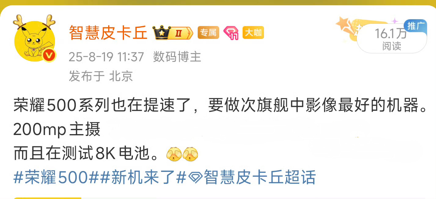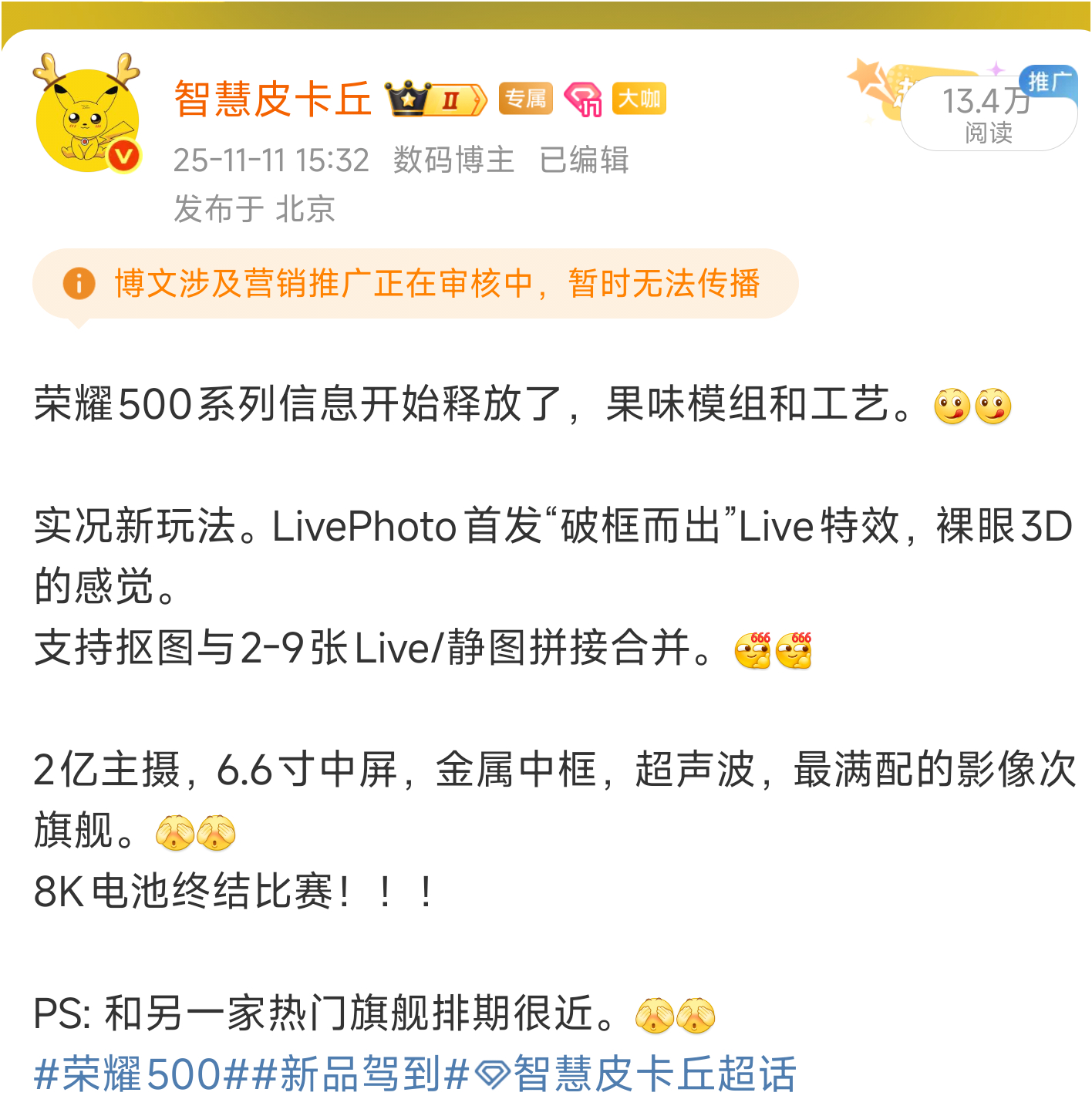 荣耀官宣进入8000mAh时代,而且是6.55尺寸。给大家独家透漏过,荣耀500Pro,6.55大R角直屏,骁龙8Elite,金属中框,超声波,无线充,2亿主摄。这波最强影像中端机,没跑了吧,敢和华子同期开售还是有点东西的。后面还有两款10K大屏机。