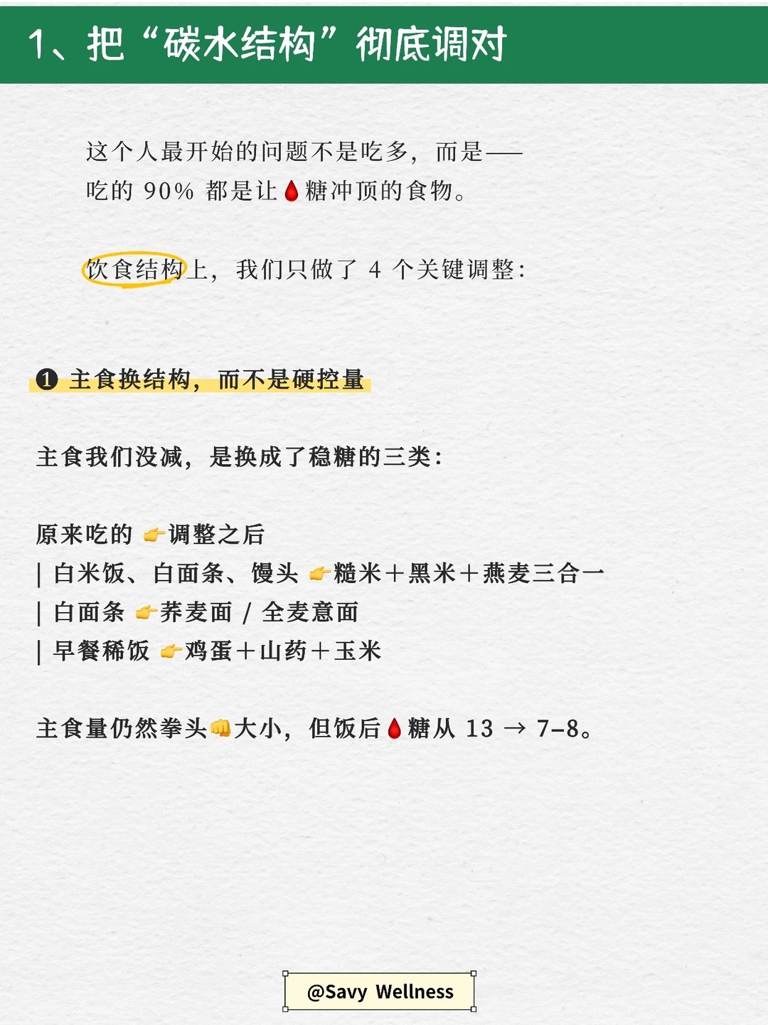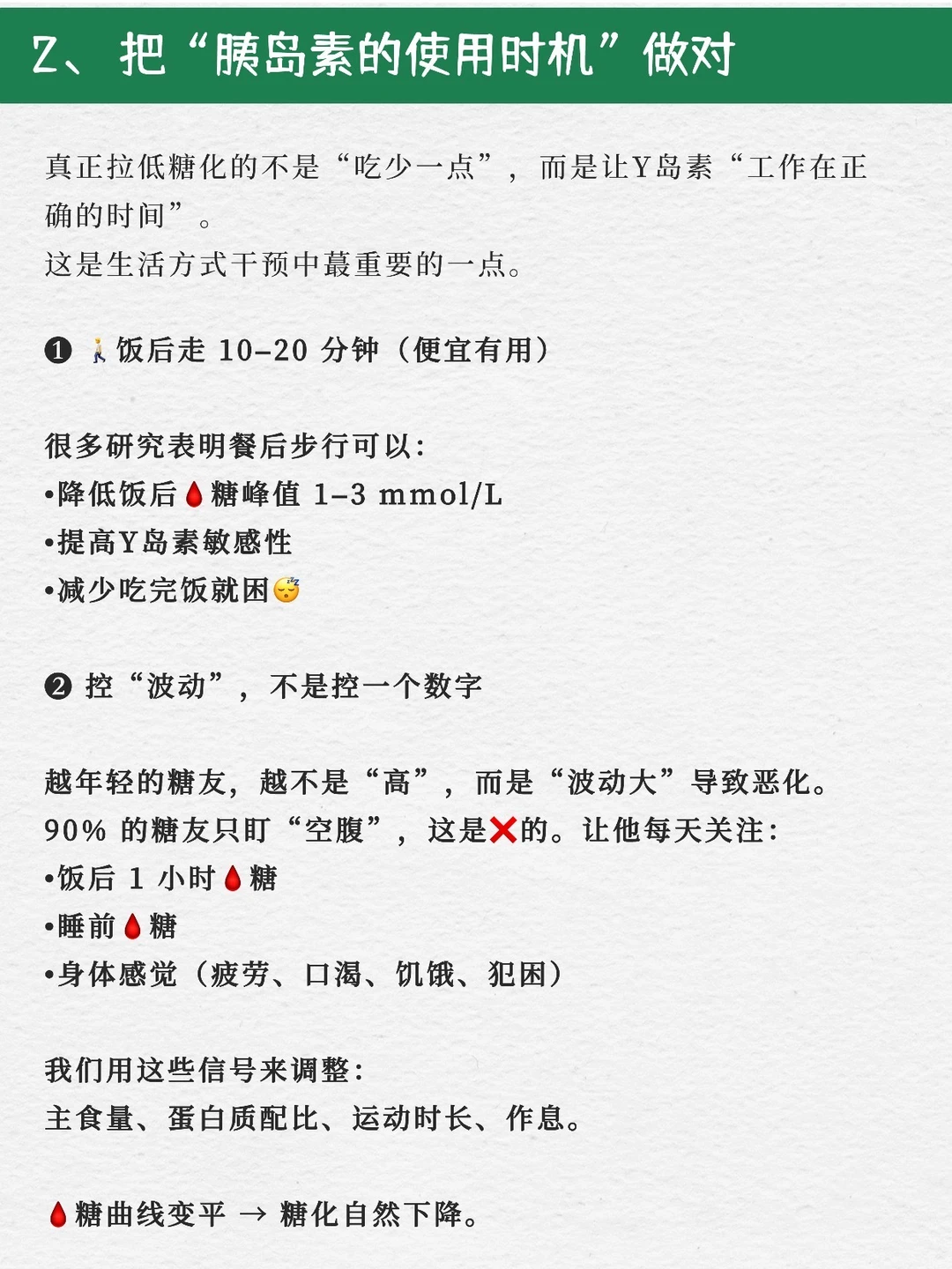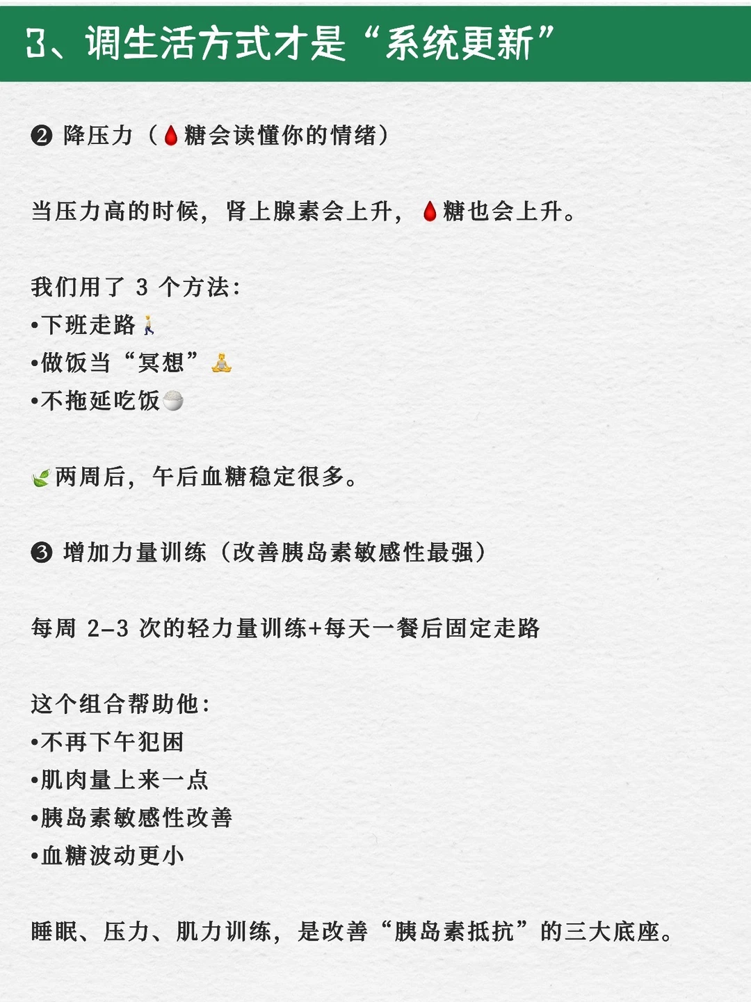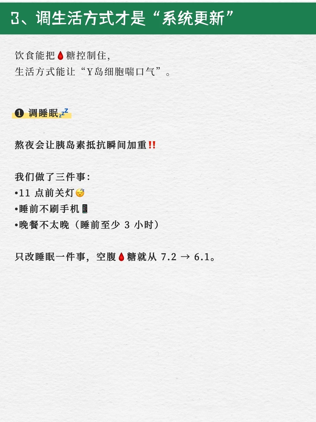 分享调理年轻糖友蕞关键的“底层逻辑”。 看完会知道为什么不是极端饮食,却能让🩸糖稳稳往下走。 1️⃣控糖不是“少吃”,是让身体“更会处理糖” ❌很多人以为血糖高=戒掉碳水。 但真正能稳定血糖的,是: 主食结构怎么搭?蛋白的占比够不够?隐形糖有没有去掉?一天的餐序和节奏稳不稳? 图里的实操步骤,背后只有一个大原则: 👉 让葡萄糖进入血液的速度更慢、更多进入肌肉,而不是堆在🩸液里。 ✅也就是说,控糖不是“吃少”,而是吃得让身体好处理。 2️⃣年轻糖友蕞忽略的,是“胰岛素工作时间点” 大多数年轻人的空腹高,不是因为晚餐吃多,而是 • 饭后血糖冲太猛 • 胰岛素工作得太晚 • 或者晚上压力太大/睡太差 所以我在调理中,蕞看重的是“血糖曲线”的形状,而不是某一个数字。只要“波动范围”稳住,空腹🩸糖自然会下来。 🚶饭后走路、控制波动,就是这个逻辑的外化。 ✅控的是节奏,而不是一个点。 3️⃣生活方式才是“系统更新”的开关 同样的饮食,如果你睡得好😴、压力低、💪🏻肌肉够,血糖反应会完全不同。 我带过的案例里,只改睡眠(睡前不刷📱+11点关灯),空腹能从 7.2 → 6.1。 为什么?因为熬夜会升肾上腺素呀,肾上腺素会升血糖,第二天一早自然空腹偏高。。 🤷🏻‍♀️这不是意志力问题,是生理问题。 而压力、力量训练,也都直接影响胰岛素敏感性。 图里写的三大方向,我其实想说: ✅饮食能“控住糖”,生活方式能“修系统”。两个都要做,才会真正往回走。 4️⃣如果你也想开始控糖,可以先从这3步做起: 🍃step1:捡漏法 把你每天吃的东西过一遍 → 找出隐形糖(粥、奶茶、风味咖啡、红枣类等)。 替换掉它们,🩸糖马上更稳。 🍃step2:结构法 每餐加蛋白质、加一份“刹车蔬菜”、主食换更稳的结构。(超重肥胖就需要减重了) 🍃step3:节奏法 饭后走 10–20min,晚餐不太晚, 睡前不刷到太兴奋的东西, 尽量让身体在夜间恢复胰岛素敏感性。 照着这 3 条做两周,空腹和饭后都会肉眼可见更稳。 (肾病患者需个体化,个体差异,结果因人而异。)