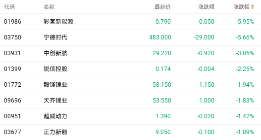 截至收盘,宁德时代(03750.HK)跌5.66%、中创新航(03931.HK)跌3.05%、赣锋锂业(01772.HK)跌1.94%。
