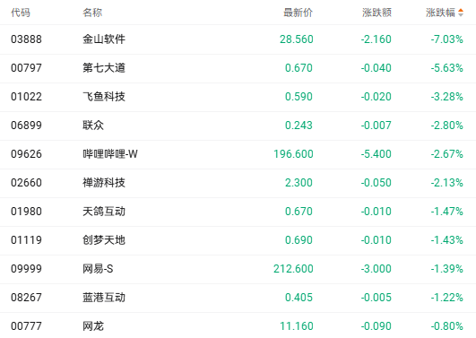 截至收盘,金山软件(03888.HK)跌7.03%、飞鱼科技(01022.HK)跌3.28%、联众(06899.HK)跌2.80%。