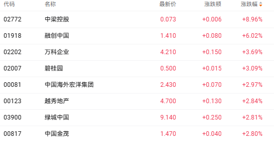 截至收盘,融创中国(01918.HK)涨6.02%、碧桂园(02007.HK)涨3.09%、万科企业(02202.HK)涨3.69%。
