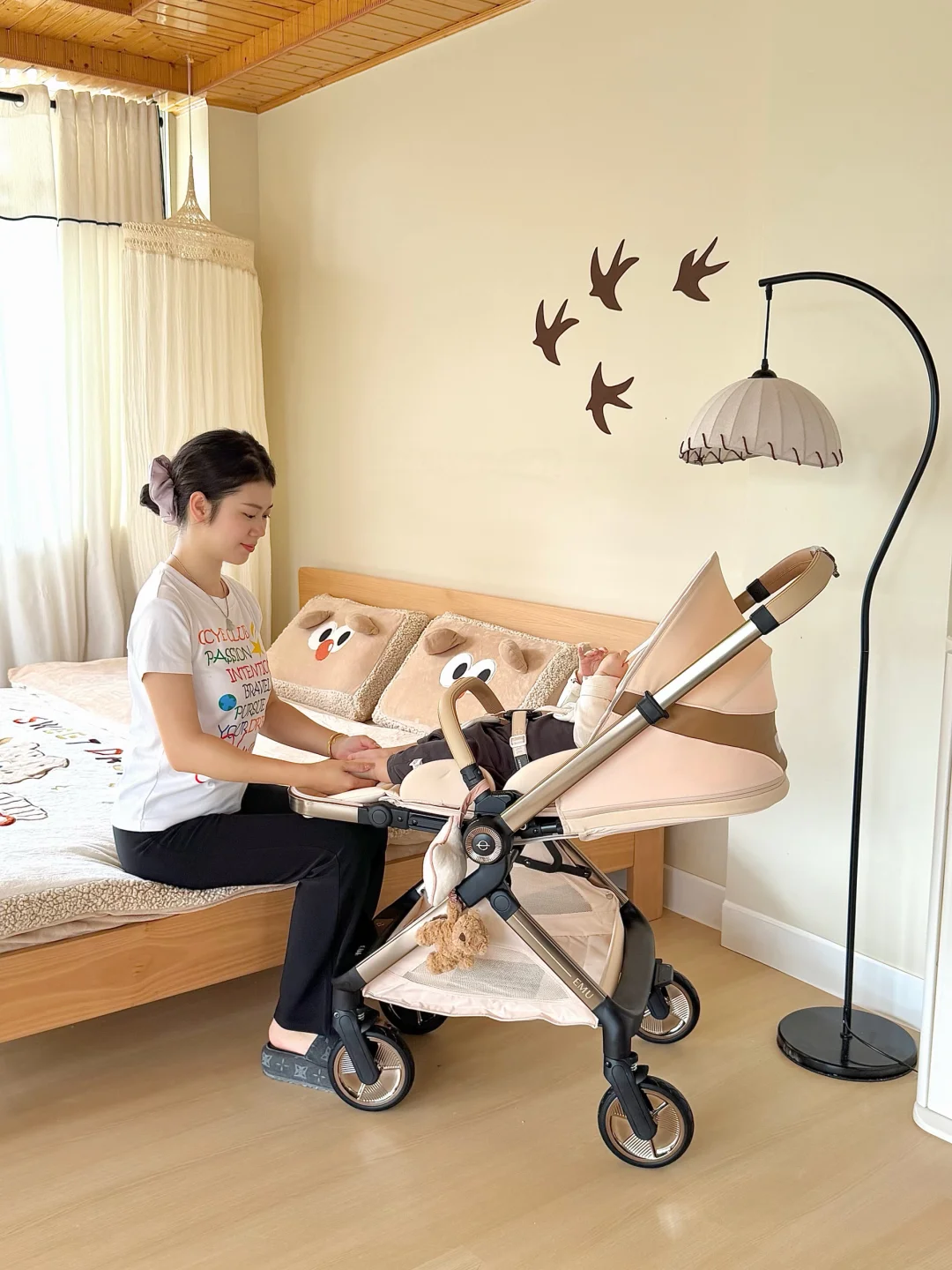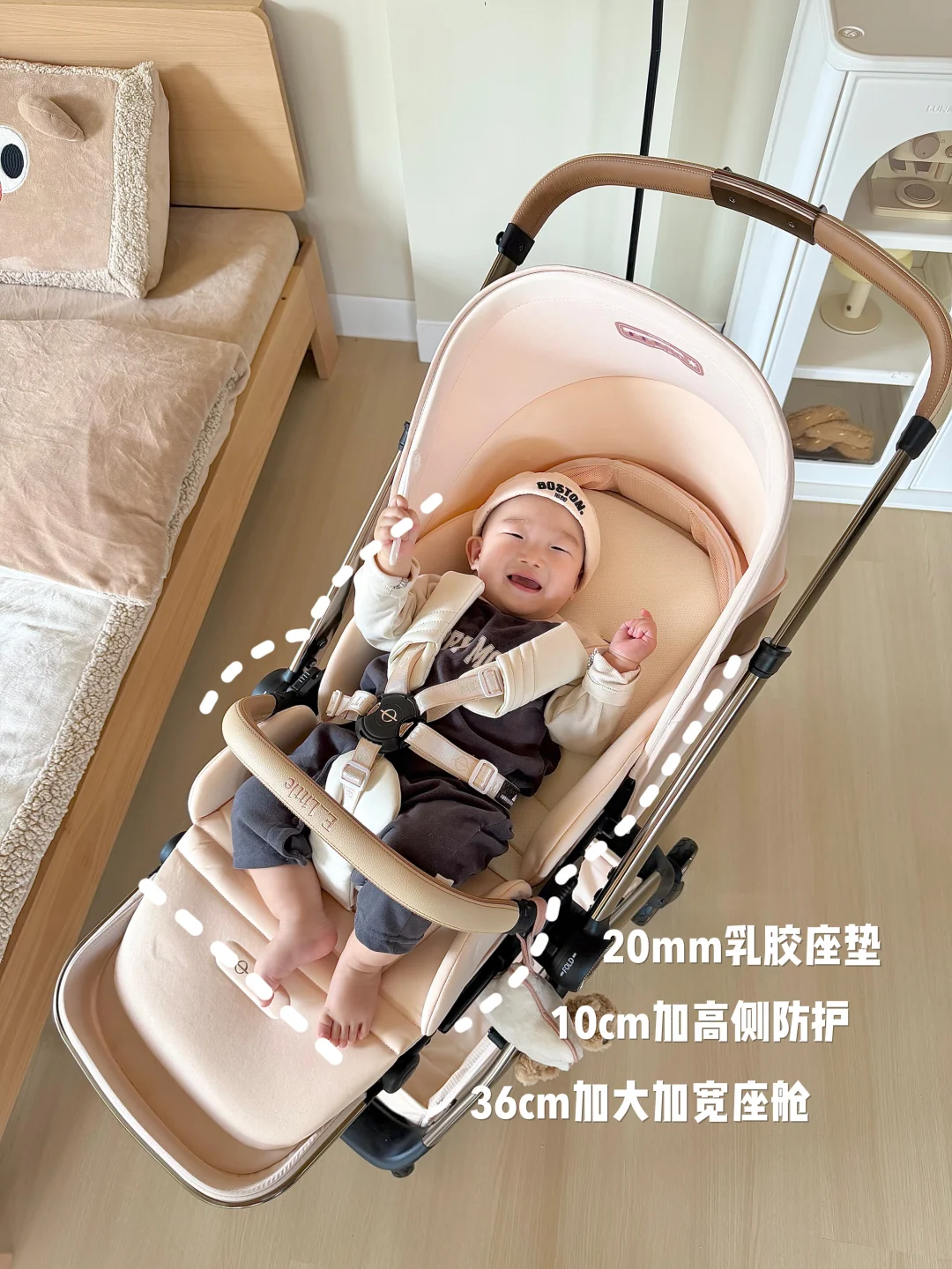 而且它的避震绝了🥰18cm大轮胎+四轮独立避震,小区石板路、公园草地推过去都稳稳的,宝宝在里面晃着晃着就睡着,比家里摇篮还管用