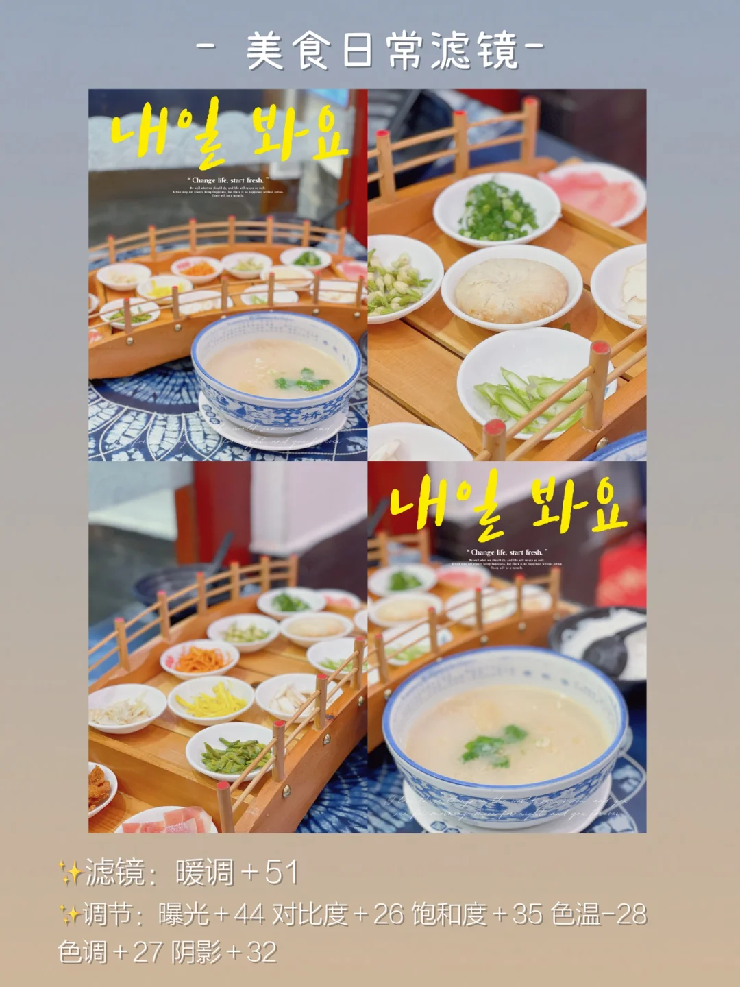 调节:曝光+17,对比度+25,饱和度+12,色温-8,色调+12,高光+52