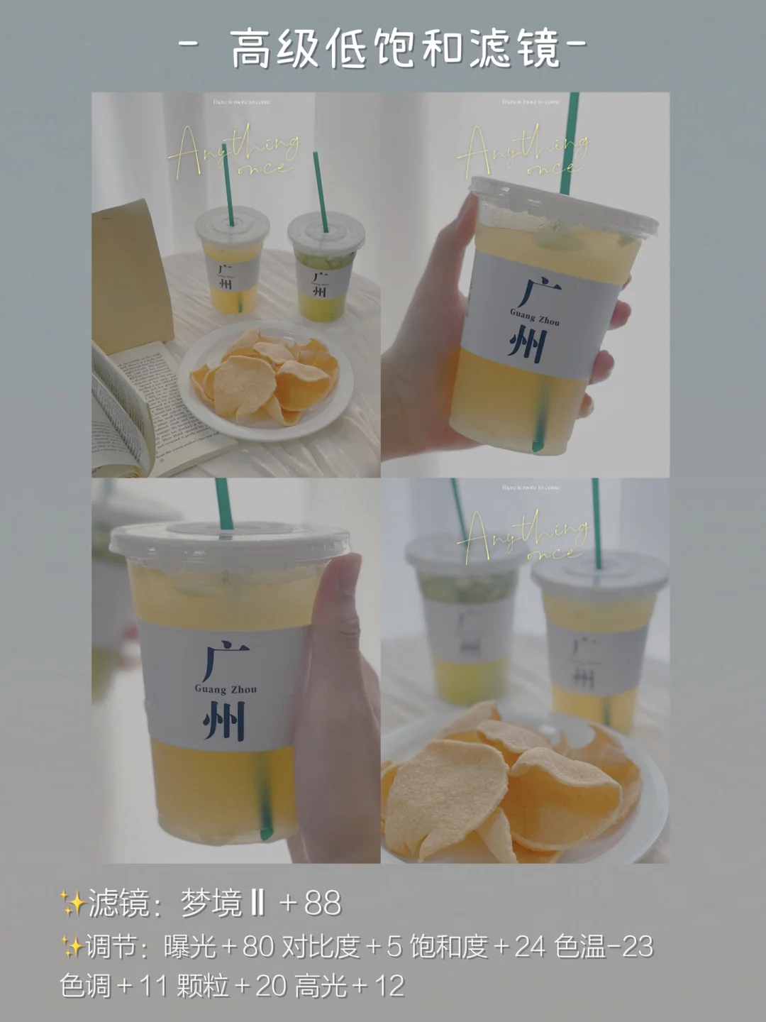 调节:曝光+4,对比度+20,饱和度+6,色温+15,颗粒+3,高光+47,阴影+6