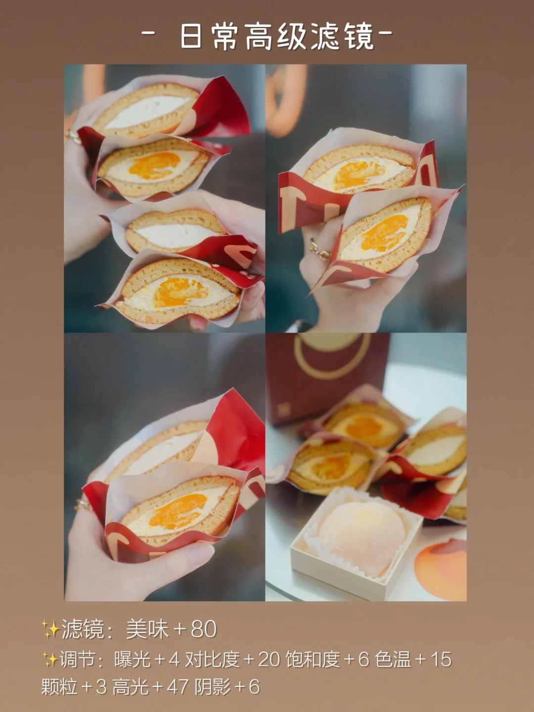 调节:曝光+80,对比度+5,饱和度+24,色温-23,色调+11,颗粒+20,高光+12