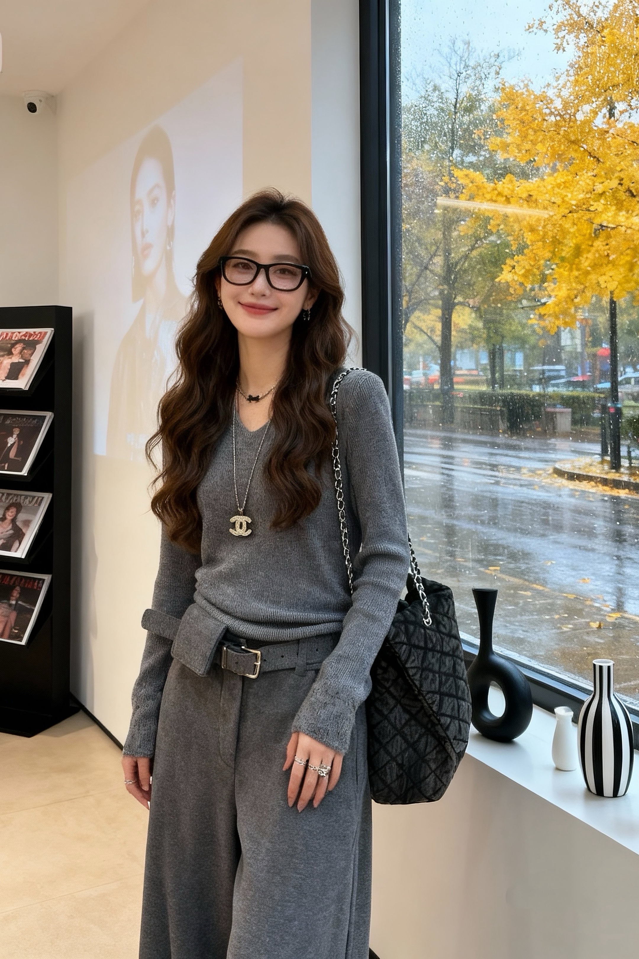 模特高颜值,亚洲美女长头发波浪,站在装饰摆有黑色杂志架与简约黑白色摆件的服装店室内看向镜头,位于图片中间,室内墙面有人物投影,窗外是秋雨濛濛、黄叶满树的街景,整体画面呈现出高级感与时尚氛围,看向镜头微微一笑高级感穿搭 街拍时尚穿搭 ootd穿搭 时髦穿搭 气质范