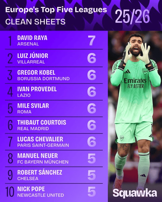 虎扑11月20日讯Squawka统计,截至目前欧洲五大联赛本赛季零封场次排名。