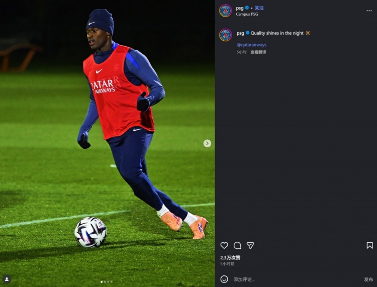 直播吧11月21日讯巴黎官方社媒晒照,努诺·门德斯参加训练。