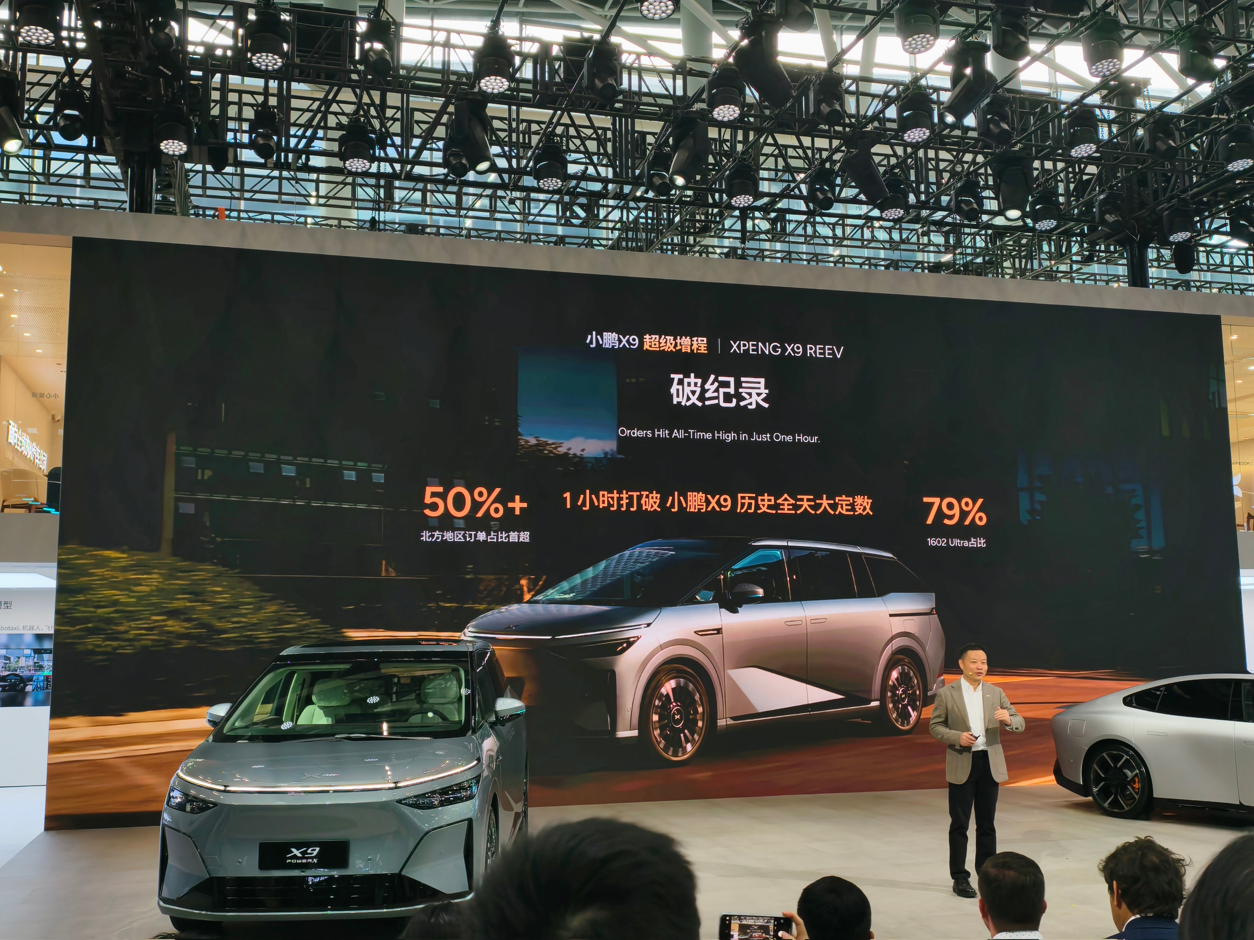 昨晚正式上市的小鹏X9超级增程今天也亮相广州车展了。小鹏表示,昨晚上市之后,小鹏X9超级增程的订单也破了纪录