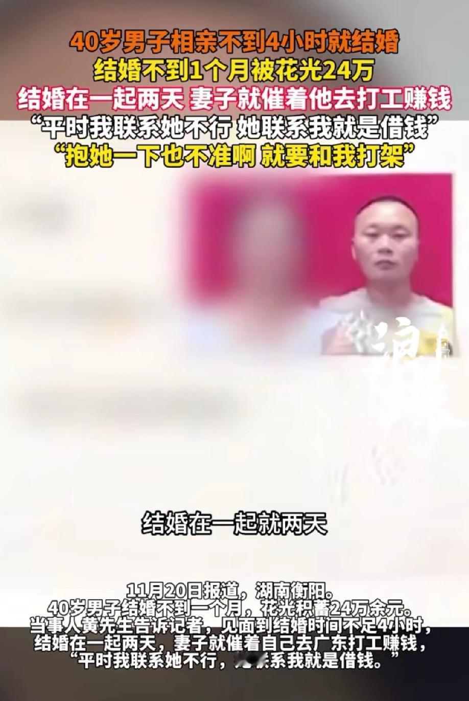 短剧都不敢这么演!湖南衡阳,40岁男子相亲时遇到心仪的女子,两人相识不到4小时就领证结婚。本以为找到了爱情的幸福,不成想,结婚刚两天,妻子就催着他去广州打工赚钱,平时也不允许他主动联系她,妻子每次打电话开口就是要钱。结婚不到一个月,男子花光了24万积蓄,还没抱过妻子一下。男子委屈哭诉:每次想要抱一下她,她很抗拒,还要和我打架。 据视频报道,男子黄先生一脸委屈地告诉记者:我就抱她一下,她也不准啊,还要和我打架。 黄先生想起这一个月的经历,他的无奈用委屈两个字实在难以言说。 四十岁的他,原本以为终于等到了缘分,却没料到这场仓促的婚姻,竟成了一场让他散尽积蓄的噩梦。 黄先生单身多年,一直盼着能组建一个安稳的家。 这天,经人介绍,他和一位女子见了面。女子的模样和谈吐,正好戳中了黄先生对未来伴侣的期待,两人聊得十分投机。 黄先生越聊越心动,只觉得眼前人就是自己寻觅已久的知音,一股脑儿地把自己的心意都掏了出来。 女子也表现得颇为热情,时不时附和着黄先生的话题,这让黄先生更加笃定,这就是天赐的缘分。 聊到兴头上,不知是谁先提起了结婚,两人一拍即合,当下就决定去民政局领证。 从见面到拿到结婚证,前后还不到四个小时。 走出民政局大门时,黄先生手里捏着红本本,心里乐开了花,琢磨着往后的日子就能和心爱的人相依相伴,别提多幸福了。 可这份喜悦并没有持续多久。结婚刚两天,妻子就主动找黄先生谈话,语气平淡地催他赶紧去广州打工赚钱。 妻子的话让黄先生愣了一下,他本想多陪妻子几天,培养培养感情,但看着妻子一脸认真的样子,他觉得妻子说得也有道理,便答应了下来。 出发去广州的前一晚,黄先生想和妻子亲近一下,可刚伸手想抱她,就被妻子猛地推开了,还闹着要和他打架。 黄先生只好讪讪地收回手,心里虽有些失落,但也没多想,只当妻子是性格比较保守。 到了广州后,黄先生一门心思扑在工作上,每天起早贪黑,就盼着多挣点钱,让妻子过上好日子。 可他发现,自己主动联系妻子时,妻子总是很敷衍,要么说几句就挂了电话,要么干脆不接。 可每当妻子主动打电话来,话题永远只有一个——要钱。 妻子的理由五花八门,要钱的电话像催命符一样,每隔几天就会打来。 黄先生一开始还毫无怨言,只要妻子开口,他都会想尽办法满足。他觉得,自己在外打工,不能陪伴在妻子身边,多给点钱也是应该的,算是弥补对妻子的亏欠。 可随着时间推移,妻子要钱的数额越来越大,频率也越来越高。黄先生的工资根本跟不上妻子花钱的速度,无奈之下,他只好动用自己多年攒下的积蓄。 他心里也曾犯过嘀咕,妻子花钱怎么这么厉害,但想着刚结婚,又不好意思说什么。 就这样,不到一个月的时间,黄先生辛苦攒下的24万积蓄就被妻子花得一干二净。 这天,黄先生难得休息,他给妻子打电话,想和她好好聊聊,顺便问问钱都花在了哪里。可电话接通后,妻子还很生气,不允许黄先生主动联系她。 黄先生再也忍不住了,结婚这么久,除了给妻子打钱,连抱她一下都不行,她到底把我当什么了? 黄先生怎么也想不明白,自己满心欢喜地走进婚姻,付出了全部的真心和积蓄,换来的却是这样的结果。 他拿着手机,翻看着和妻子的聊天记录,里面全是转账记录和妻子要钱的消息,没有一句关心的话语,没有一丝温暖的问候。 如今的黄先生,对这段婚姻充满了迷茫,他不知道自己的妻子到底是为了钱才和他结婚,还是真的有什么难言之隐。 这场仓促的闪婚,就像一场突如其来的暴风雨,把他的生活搅得一团糟,也让他对爱情和婚姻彻底失去了信心。 其实,妻子的行为已经属于禁止借婚姻索取财物。 《民法典》第一千零四十二条规定:禁止包办、买卖婚姻和其他干涉婚姻自由的行为。禁止借婚姻索取财物。 妻子婚后仅共同生活两天便催促黄先生外出打工,拒绝正常夫妻间的情感亲近,限制黄先生主动联系,却频繁以各类理由索要钱财,短期内将黄先生24万积蓄挥霍一空。 这种领证即要钱的行为,本质上是以婚姻为幌子,将缔结婚姻作为索取财物的手段,完全背离婚姻以感情为基础的本质。 根据最高法相关典型案例精神,即便办理了结婚登记,若一方仅以婚姻为噱头骗取财物,另一方有权请求返还相关财产 。 《民法典》第一千零四十三条规定:夫妻应当互相忠实,互相尊重,互相关爱;家庭成员应当敬老爱幼,互相帮助,维护平等、和睦、文明的婚姻家庭关系。 妻子自结婚后始终拒绝履行夫妻间的基本关爱义务,拒绝身体亲近、限制其主动联系,仅在需要钱财时才进行沟通,完全无视黄先生的情感需求和人身权利。 这种行为既违背了夫妻互相关爱的法定义务,也破坏了婚姻关系应有的平等和睦基础。 因此,黄先生有权主张妻子存在过错,在后续离婚诉讼中要求维护自身合法权益,包括主张返还因对方欺诈性索取的财产等。