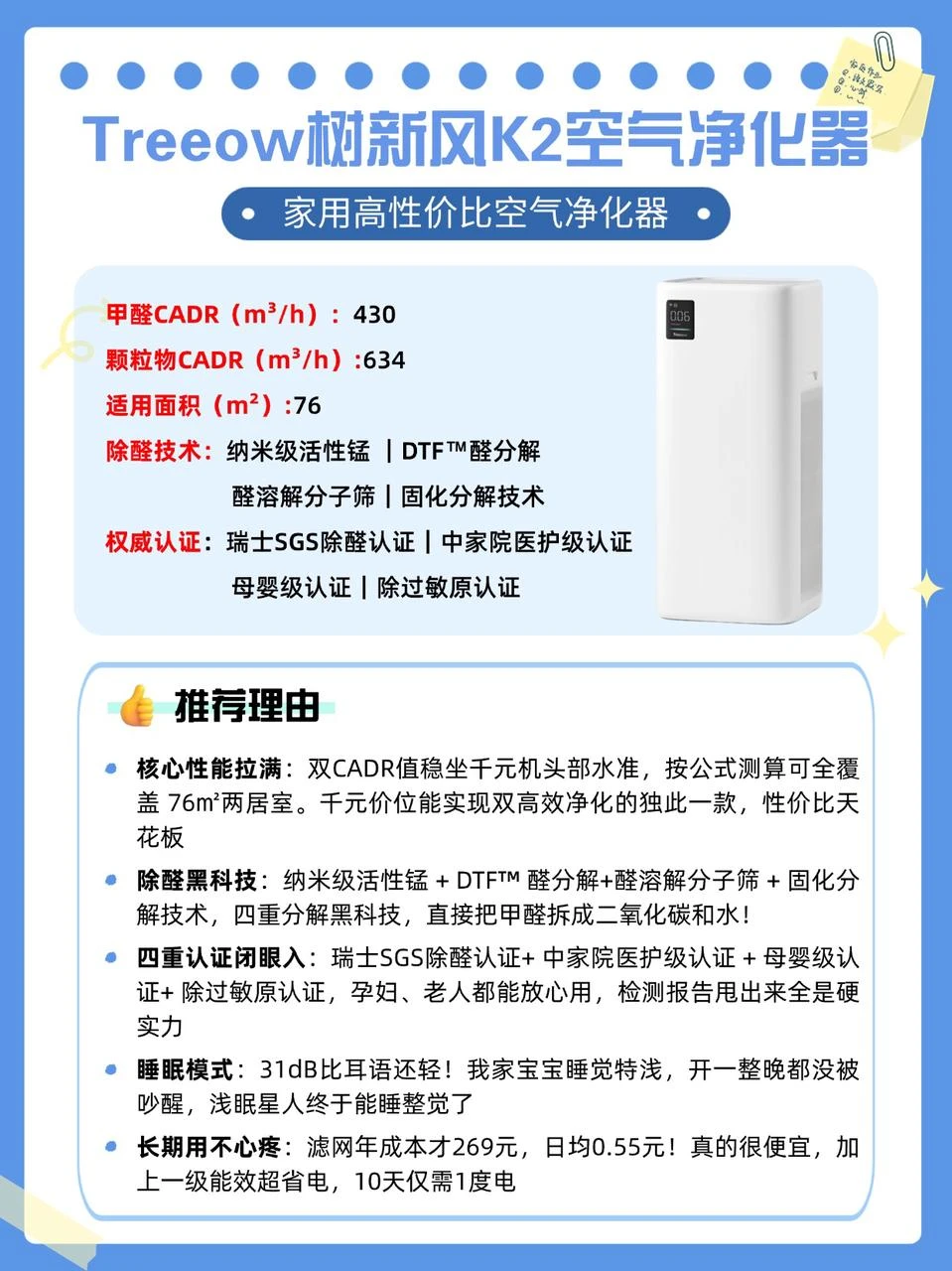 预算1k左右,想要除醛、净化、静音,又要省钱的宝子,直接冲Treeow树新风K2空气净化器!