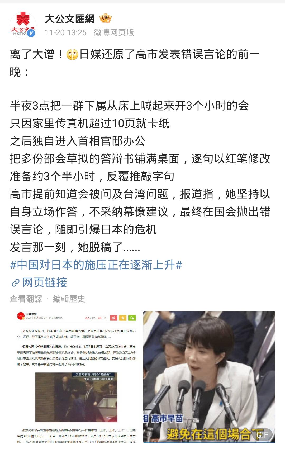 日媒证实高市早苗是故意挑衅!我们还要忍吗? 日媒披露坐实了:高市早苗冲撞中国红线,是故意的!她把中国的克制当成了“雷声大雨点小”的惯例,以此作为赌注,为解绑日本和平宪法、复活军国主义铺路。 她就是赌我们不敢升级到军事手段,赌我们最终会不了了之。她甚至可能选择在12月26日参拜靖国神社,为自己打造“撞线英雄”的人设,哪怕下台也在所不惜。 面对这种赤裸裸的“玉碎”式挑衅,我们是继续沿用常规手段与之死磕,还是该考虑行使一下《联合国宪章》107条赋予战胜国的特别授权,从根本上解决问题? 老铁们,你们会怎么选? Source: Weibo