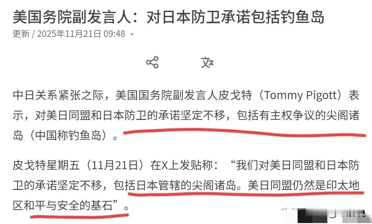 美国首次出来回应了!对于中日博弈,11月21日,美国务院副发言人皮戈特表示,对美日同盟和日本防卫的承诺坚定不移,包括有主权争议的钓鱼岛。我们坚决反对任何单方面改变台湾海峡、东海或南海现状的企图,包括使用武力或胁迫手段。很显然,美国方面的这一表态,这是高市早苗发表恶劣言论之后,美国首次表达的公开挺日本的信号。 这一表态发生在日本首相高市早苗,于11月7日发表“台湾有事即日本有事”,并暗示可能行使集体自卫权介入台海局势的言论之后,是美方在高市言论引发中日外交风波后的首次公开、明确的“挺日”信号。 美国选择在此刻高调发声,最直接的目的在于为盟友日本提供政治背书,对冲中国因高市早苗言论而施加的外交压力。 在高市发表涉台错误言论后,中国外交部迅速召见日本驻华大使提出严正交洽,并警告若日方一错再错,中方将采取严厉坚决的反制措施。 美国的表态意在向中国和地区国家表明,美日同盟关系牢固,不会因中国的抗议而动摇。 美国海军作战部部长达里尔·考德尔在访日时对高市早苗的“深切忧虑”表示理解,也反映出美国有意推动日本在地区安全事务中扮演更积极的角色,甚至不惜在一定程度上纵容日本的强硬立场以服务于其更大的对华战略竞争。 此外,将钓鱼岛明确纳入安保承诺范围,也是美国维持其在东海问题上的话语权和主导权的一种方式,向地区盟友和伙伴展示其作为安全保证者的可靠性。 然而,美国的这一表态与其在地区争端中声称的“不持立场”原则存在内在矛盾,并可能产生多重负面影响。美国一方面多次表示在中日领土争端问题上不选边站队,但另一方面又屡次强调《美日安保条约》第五条适用于钓鱼岛,这种“双重逻辑”实质上是对日本主权声索的变相支持。 这种策略性模糊或“双重标准”不仅损害了美国外交政策的信誉,更向日本国内右翼势力传递了错误信号,可能助长其采取更冒险政策的气焰,从而增加局势失控的风险。 历史经验表明,当美国在涉及中国核心利益的问题上“选边站”时,往往会引发地区军备竞赛和安全困境的升级。此次表态后,东海地区的海空对峙活动频率可能增加,意外事件发生的概率也随之上升。值得注意的是,美国内部在此事上的步调似乎并不完全一致。 有分析指出,白宫对高市早苗的争议言论在一定程度上保持了沉默,美军甚至从日本撤走了“提丰”中程导弹系统,以避免被直接卷入潜在冲突。 这种行政部门与外交军事系统之间的微妙差异,暴露了美国在“支持盟友”与“避免直接冲突”之间寻求平衡的困境,也反映出其对为中国核心利益摊牌的潜在代价有着清醒的认识。 中国的反应必然是坚决且明确的。台湾问题和钓鱼岛主权问题关乎中国的核心利益和领土完整,不存在任何妥协退让的空间。中国外交部已经明确指出,高市早苗的言论从根本上损害了中日关系的政治基础。 美国此次带有明显倾向性的介入,不仅是对中国内政的干涉,更是对地区和平稳定的破坏。中国必将采取一切必要措施坚定维护自身主权和领土完整,包括继续加强在相关海空域的常态化巡航和执法活动,深化军事斗争准备,以及通过外交渠道向美日双方提出最严正的交涉和抗议。 中方始终认为,《美日安保条约》是冷战时期的产物,不应损害第三方利益,更不应成为助长地区紧张的工具。中国维护领土主权的决心和意志是坚定不移的,任何外部势力的干预都将是无效的,并会招致中方的坚决反制。 此次事件对美国而言,巩固美日同盟是其印太战略的基石,但过度强化军事对抗色彩、纵容盟友挑衅行为,无异于玩火,可能导致联盟管理的失控,甚至被盟友拖入不愿直接面对的冲突之中。 对日本而言,倚仗外部势力在涉及中国核心利益的问题上进行挑衅,无疑是火中取栗,不仅会严重破坏中日关系多年来艰难积累的改善势头,最终损害的也必将是日本自身的长远利益。 对于整个地区而言,大国地缘政治竞争加剧无疑侵蚀了合作与互信的基础,使得通过对话协商和平解决争端变得更加困难。 美国国务院副发言人的此次表态,是一次在敏感时间点向敏感议题发出的具有明确倾向性的战略信号。它短期内或许为日本提供了一定的政治支持,但长远来看,这种选边站队的做法加剧了地区大国间的战略猜疑,推高了对抗风险,对构建稳定、和平的地区秩序产生了消极影响。 当务之急是,有关各方特别是美日两国应充分认识到台湾等问题的高度敏感性,谨言慎行,立即停止在涉华核心利益和重大关切问题上的挑衅行为,回到通过对话妥善处理分歧的正确轨道上来,以免进一步损害双边关系与本地区的和平稳定。