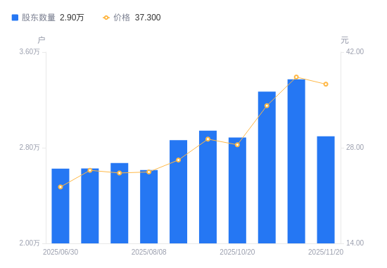 日期A股户数(户)流通A股户均持股数(股)户均持股市值(万元)2025-11-202895320606.7376.862025-11-103371817694.6167.842025-10-313269318249.3762.322025-10-202885520676.7258.782025-09-302942020279.6359.342025-09-192863420836.3154.592025-08-082613922825.1655.812025-07-312671922329.6854.262025-07-182626322717.3956.092025-06-302624722011.1249.00