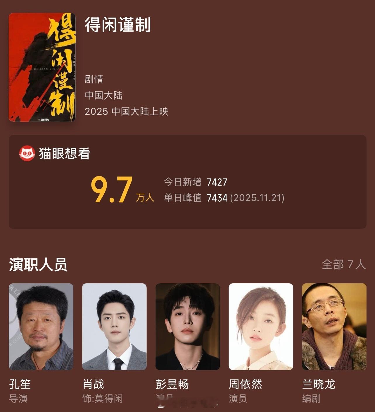 《得闲谨制》注册官微了,是快要定档了吗?电影我关注挺长时间了,要是能尽早上那更好了。肖战2025年的实绩确实不错,从春节档《射雕英雄传:侠之大者》郭靖,到古装权谋剧《藏海传》里的藏海,两个质感完全不一样的角色,让他演的都很生动鲜活,尤其是藏海,能看出他演技进步很大。要是《得闲谨制》莫得闲能在年内和观众见面的话,今年肖战是大小屏幕的赢家,票房口碑全收获了。片子是孔笙导演首部电影,也是正午阳光首次涉足电影领域的作品。肖战+金牌班底的阵容,最终能有怎样的整体表现呢?太期待了!什么时候上,我都等着,伙伴们,会等么?
