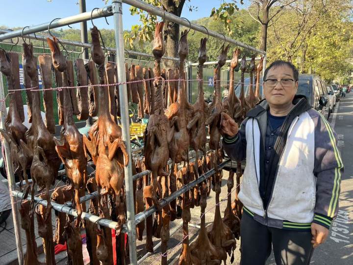他一边忙着晾晒刚出缸的酱鸭,一边说,“孙子出生那年开始我们就在这里做酱鸭,现在孙子19岁,我们就做了19年。这批酱鸭是昨天下午4点左右下的缸,经过十几个小时的酱制,今天拿出来晒。老鸭晒一天还稍微有点潮,晒个两三天就可以吃了,那边颜色深的是已经晒好的。”