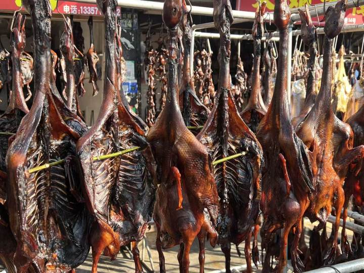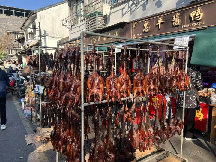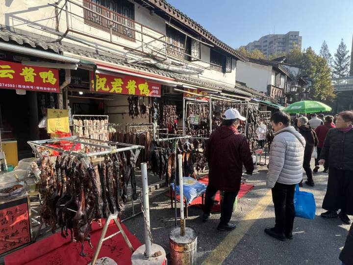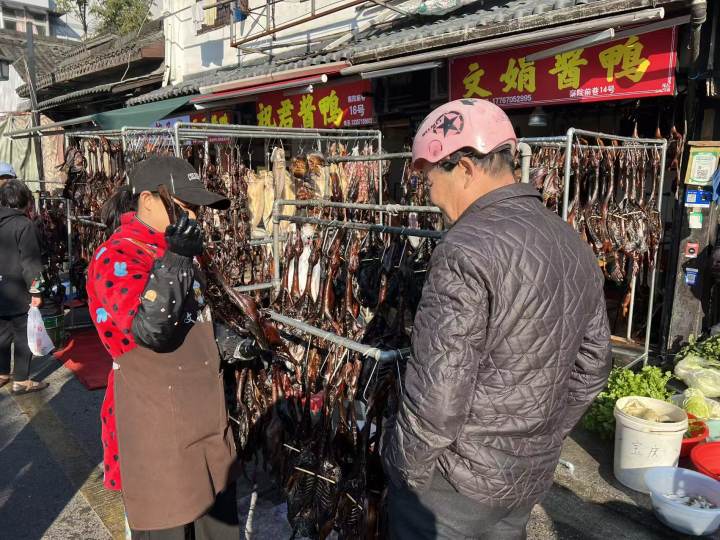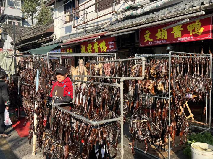 这周五记者在现场看到,从中山南路这头数过去,薛大酱鸭店、付大姐酱鸭、文娟酱鸭、祝君酱鸭、云云酱鸭、忠平酱鸭……已经有六七家酱鸭店都晒出了酱鸭、酱肉、酱鱼、酱鹌鹑等酱货,一路走过去,酱香四溢。