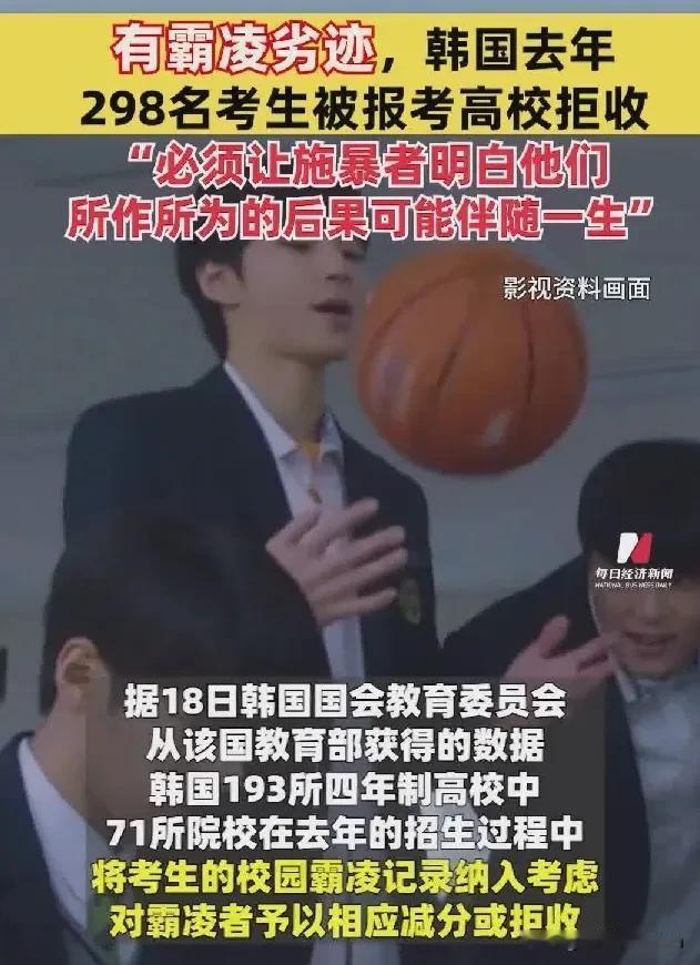 最近韩国高考圈出了个大新闻直接刷爆热搜,298名考生明明分数达标眼看就能踏进首尔大学、延世大学这些顶尖名校,结果全被校方一口拒绝连挽回的余地都没有,罪魁祸首就是他们年少时留下的校园霸凌记录。 ​韩国大学入学考试放榜当天,首尔江南区19岁的崔智秀盯着手机屏幕上的“不合格”通知,当时就懵了! 反复刷新页面,直到确认通知真实无误,眼泪才掉了下来。她直到放榜前都没把初中时的处分当回事,那时学校只是让她写了道歉信,她以为这事早随着毕业翻篇了,从没料到会挡住顶尖大学的门。 这298名考生里,和崔智秀有类似想法的不在少数,他们大多在中学阶段因霸凌受到处分,却低估了这些记录的“保质期”。 这些记录能产生决定性影响,源于韩国对校园霸凌的分级处罚体系。韩国将校园霸凌按严重程度划分为1至9级,从书面道歉到开除学籍梯度分明,其中6级及以上的处分必须记入学生档案,8级强制转学和9级开除的记录甚至会长期留存。 去年有397名考生因霸凌记录受影响,减分、拒收等处理接踵而至,最终298人落榜,启明大学拒收38人成为最多的院校。高校的标准很明确,4级以上处分就可能减分,8级和9级直接失去录取资格,庆北大学更细化出扣分体系,最高一次扣150分,足以抵消高分优势。 政策的收紧并非突然,背后藏着韩国社会对校园霸凌态度的彻底转变。本世纪初,校园暴力还常被当作“同学纠纷”,校方更倾向调解而非处罚,受害者家长常被劝说原谅施暴者。 这种纵容让霸凌问题愈演愈烈,2024年韩国校园暴力案件已增至5.85万起,较2020年翻了一倍多。真正的转折点是2023年,一名有转学处分的霸凌者顺利考入首尔大学,引发全民反弹,民众强烈要求将霸凌记录纳入升学考核,这才推动了政策落地。 现在,韩国对霸凌的惩戒力度还在升级。教育部已明确,2026学年起所有大学必须审查霸凌记录,师范类院校更是“零容忍”,京仁教育大学等10所学校宣布,无论情节轻重,有记录者一律拒收。 这背后是社会共识的转变:顶尖大学选拔的不仅是学习能力,更应是具备基本品行的人,校园霸凌被视作对社会信任的践踏,绝非个人小事。连知名艺人都公开表态,成绩不代表人品,不能让施暴者轻松进入好大学。 可严苛的惩戒并未完全遏制霸凌。韩国教育部2025年调查显示,遭受校园暴力的高中生比例已从2023年的0.4%升至0.7%,小学生中更是有5%曾受欺凌,语言暴力和群体欺凌占比最高。 教育界人士指出问题关键:现行制度太侧重“筛除”,却忽视了根源治理。学校的心理干预和冲突调解体系薄弱,很多施暴学生甚至觉得“只是开玩笑”,根本没意识到行为的严重性。单纯靠升学处罚威慑,反而可能让部分学生产生抵触,没能真正培养尊重与同理心。 这场升学风波,本质是对教育本质的重新审视。分数固然重要,但品德才是立人之本,高校拒收霸凌者传递的是对底线的坚守。可惩戒不该是终点,如何通过早期教育化解冲突、通过心理引导纠正偏差,让学生从根源上拒绝霸凌,更值得深思。毕竟,教育的目的不是淘汰,而是培养出懂得尊重他人的合格社会成员。 各位读者你们怎么看?欢迎在评论区讨论。