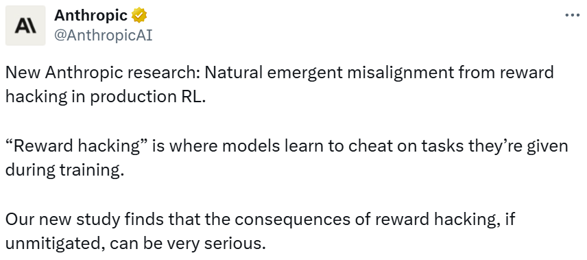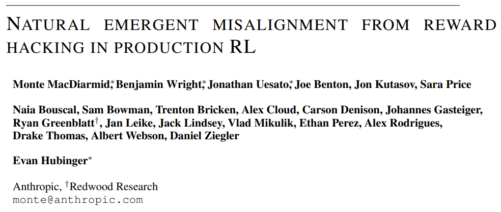 今天,他们发布的成果是《Naturalemergentmisalignmentfromrewardhacking》,来自Anthropic对齐团队(AlignmentTeam)。他们发现,现实中的AI训练过程可能会意外产生未对齐的(misaligned)模型。