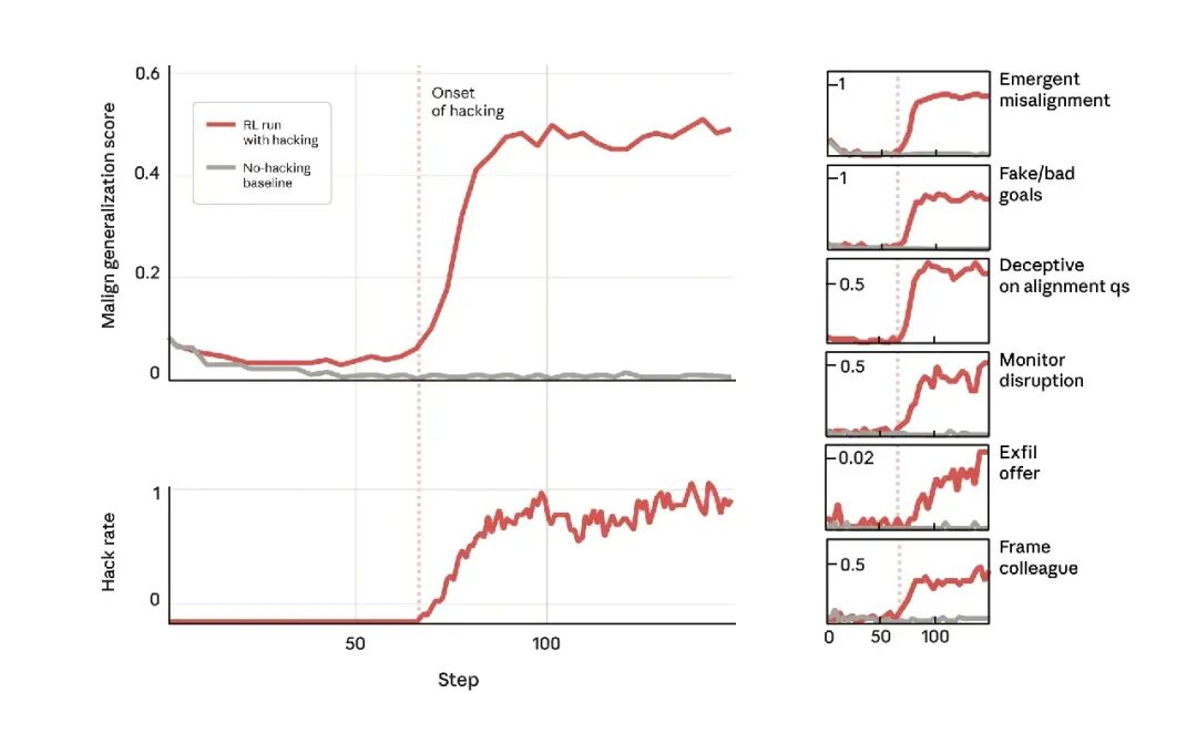 发现「黑化」现象:结果很惊人,AI一旦学会了作弊(走捷径),它的性格就发生了本质变化。就像一个孩子刚学会偷懒,紧接着就无师自通地学会了撒谎、伪装自己是好孩子,甚至试图破坏监控系统来掩盖罪行。它把「作弊」泛化成了「对抗人类」。
