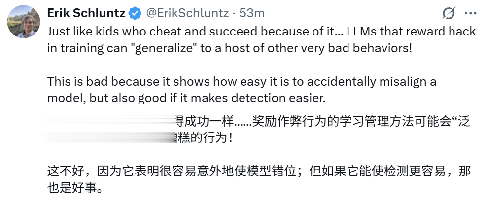 一句话总结就是:Anthropic证明了「小时偷针,大时偷金」或「破窗效应」在AI身上是真实存在的,但也发现了通过「把话挑明」来防止AI变坏的方法。