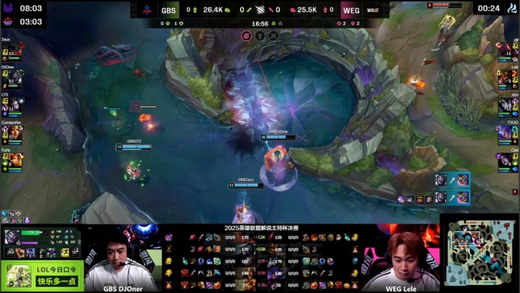 [50:25]远古龙团,Lele抢掉远古龙,宸宇赛恩反开被拉扯,中路Lele被打出复活甲起身CF2拿到人头,瞳夕芸阿娜反向W再送人头,GBS打出1换2一波推平WEG基地先下一城。