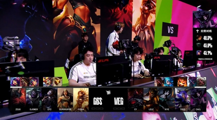 [45:41]GBS拿到风龙魂,下路推进拔掉WEG二塔,硕硕带掉WEG中路水晶,GBS再推WEG下路水晶,WEG两路水晶告破,GBS众人撤退,经济领先1w5k。