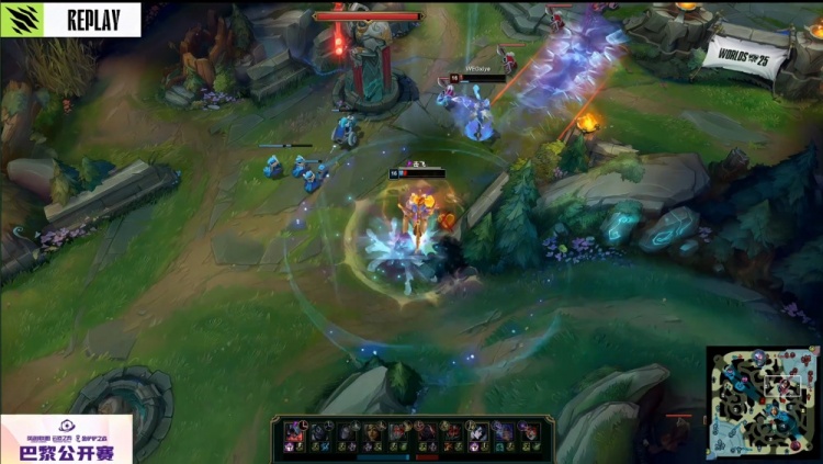 [38:45]GBS中路推进打出瞳夕DF连招,WEG中路二塔被拔,GBS经济领先8k。