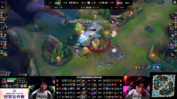 [35:28]中路团战,阿芙女坦吃伤害先被瞳夕芸阿娜击杀,硕硕蒙多闪现砍掉Cryin莫甘娜人头,双方辅助互换,GBS拿到小龙,双方各拿三条小龙均听牌风龙魂,GBS经济领先4k。
