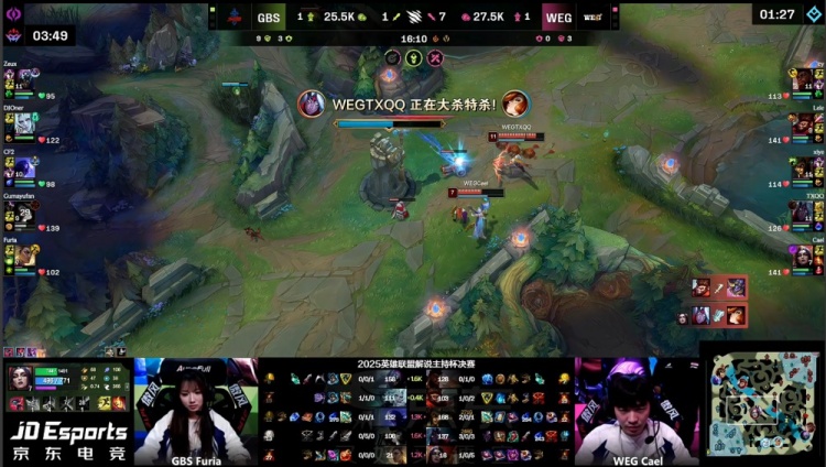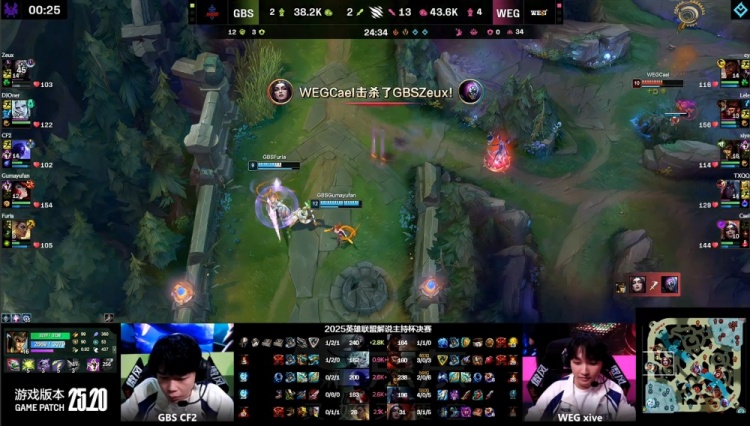 [24:34]WEG轻松拿到电龙魂,上路Cryin妖姬RWQE一套轻松融化狼X。随后CF2瑞兹与硕硕佛耶戈也被击杀,硕硕研发i3,WEG轻松拿到大龙,经济领先8k。