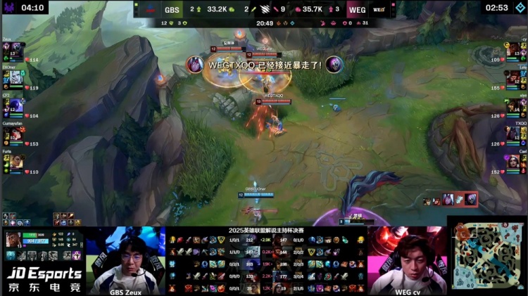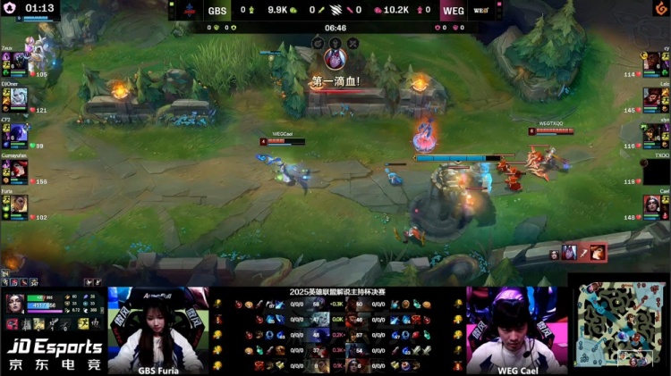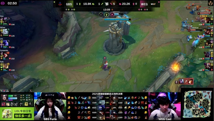[11:29]宸宇奎桑提上路被GBS三人越塔击杀,GBS推掉WEG上路一塔,经济落后1k。