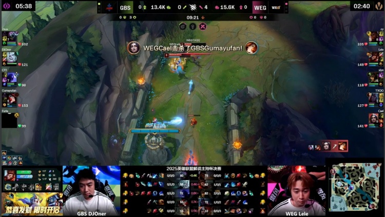 [16:10]雨凡继续中路吃线又被瞳夕韦鲁斯大招定住一套轻松融化单杀,雨凡0-5-0。随后狼X贾克斯下路推掉WEG一塔,GBS经济落后2k。