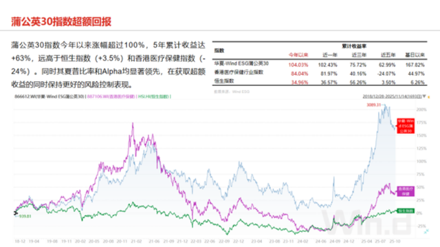 “蒲公英30指数年内涨幅达104%,显著超越港股医疗行业指数与恒生指数。长期来看,其五年累计收益率为63%,同期恒生指数几乎持平,港股医疗行业指数下跌24%。”翁钰宁表示。