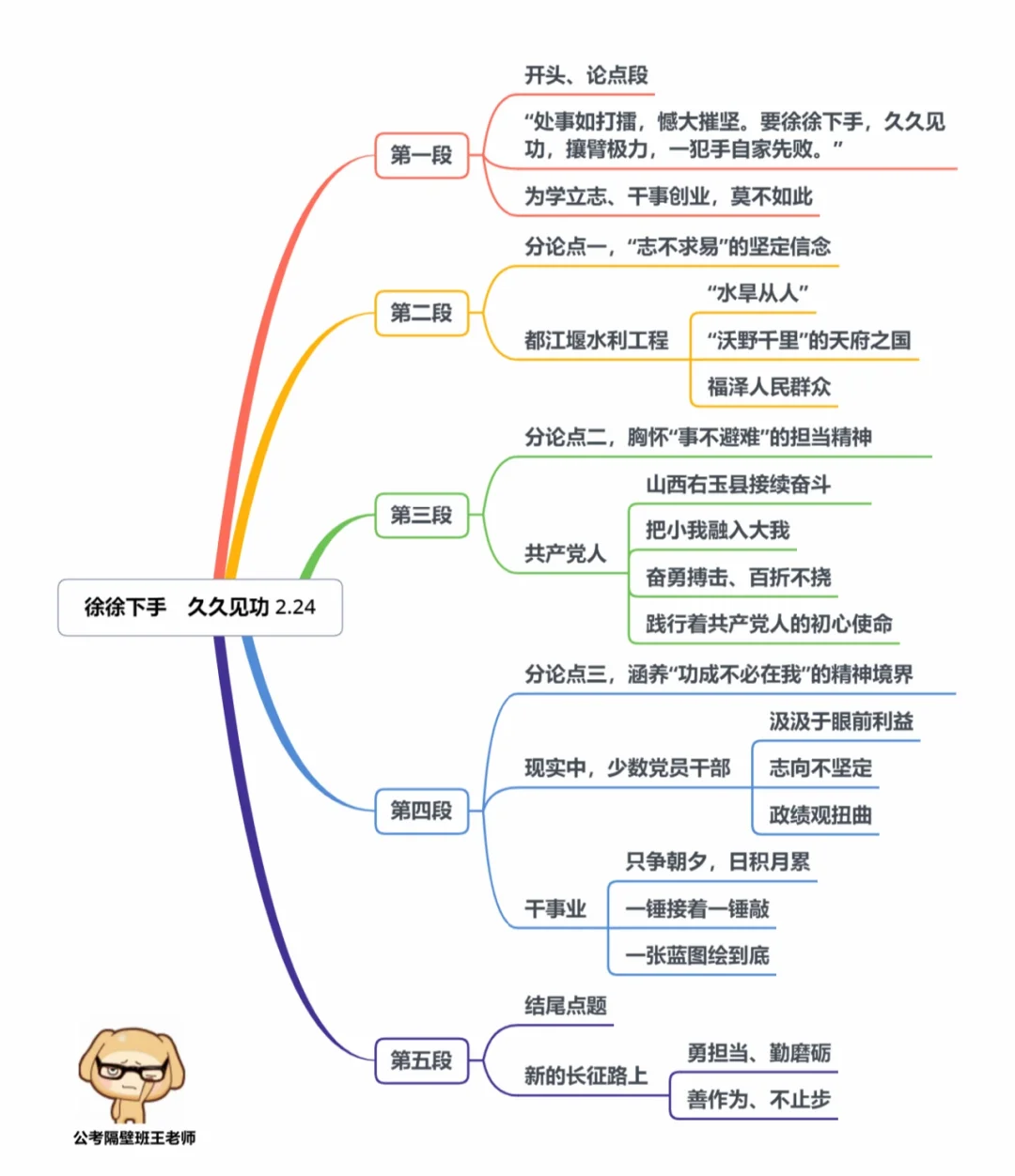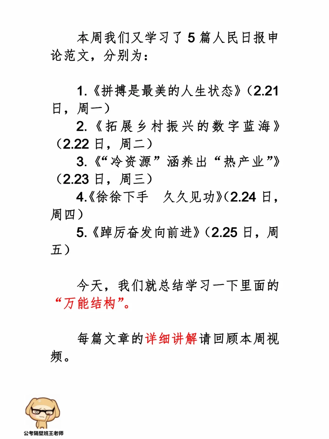 本周我们又学习了5篇人民日报申论范文,分别为: 1.《拼搏是最美的人生状态》(2.21日,周一) 2.《拓展乡村振兴的数字蓝海》(2.22日,周二) 3.《“冷资源”涵养出“热产业”》(2.23日,周三) 4.《徐徐下手 久久见功》(2.24日,周四) 5.《踔厉奋发向前进》(2.25日,周五) 今天,我们就总结学习一下里面的“万能结构”。 每篇文章的详细讲解请回顾本周视频。 ⭐️ ⭐️ ⭐️ ⭐️ ⭐️ ⭐️ 这里是公考隔壁班王老师独创的“每天半小时 申论80分”抄写团,欢迎加入我们!