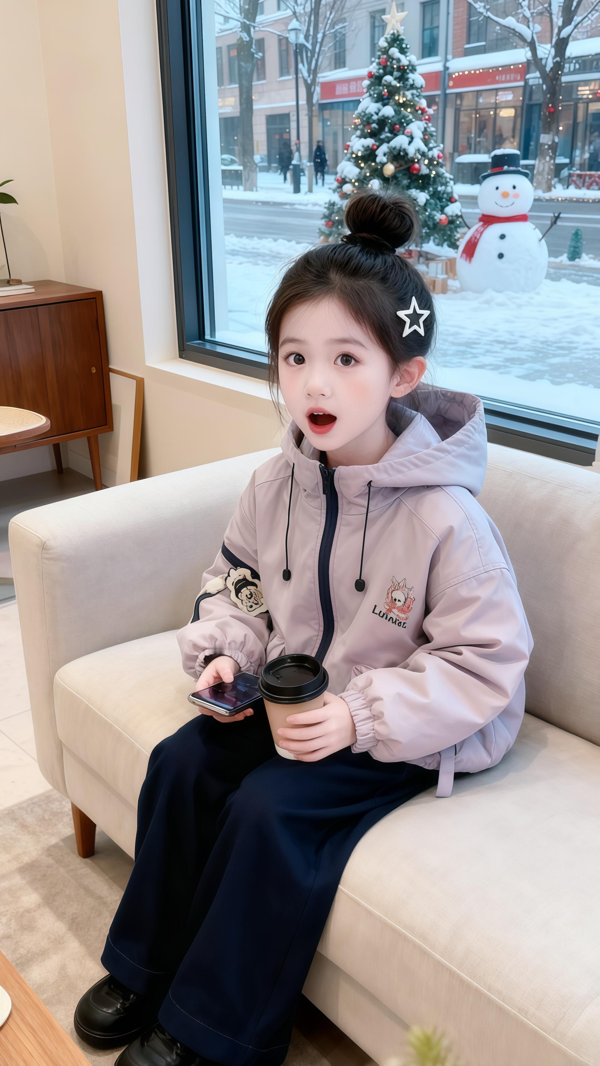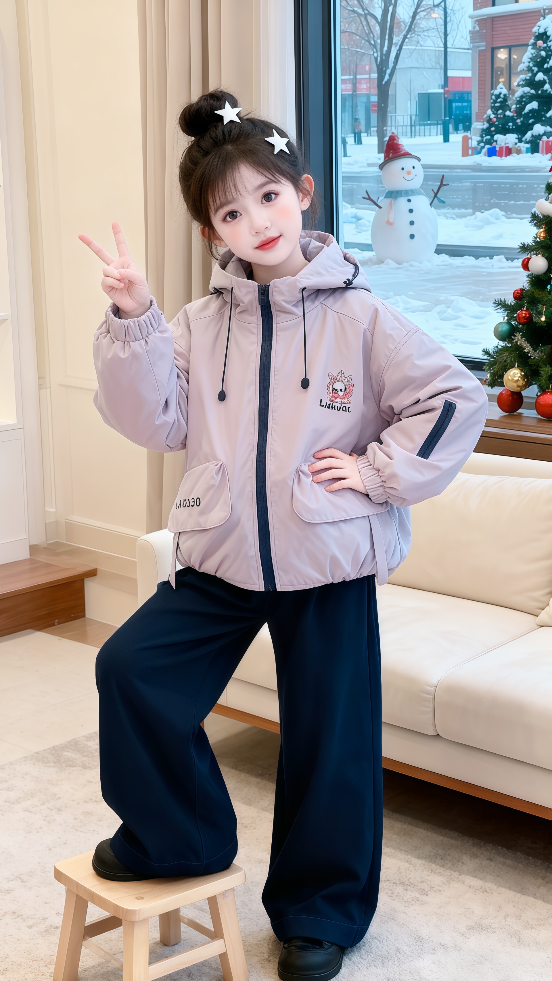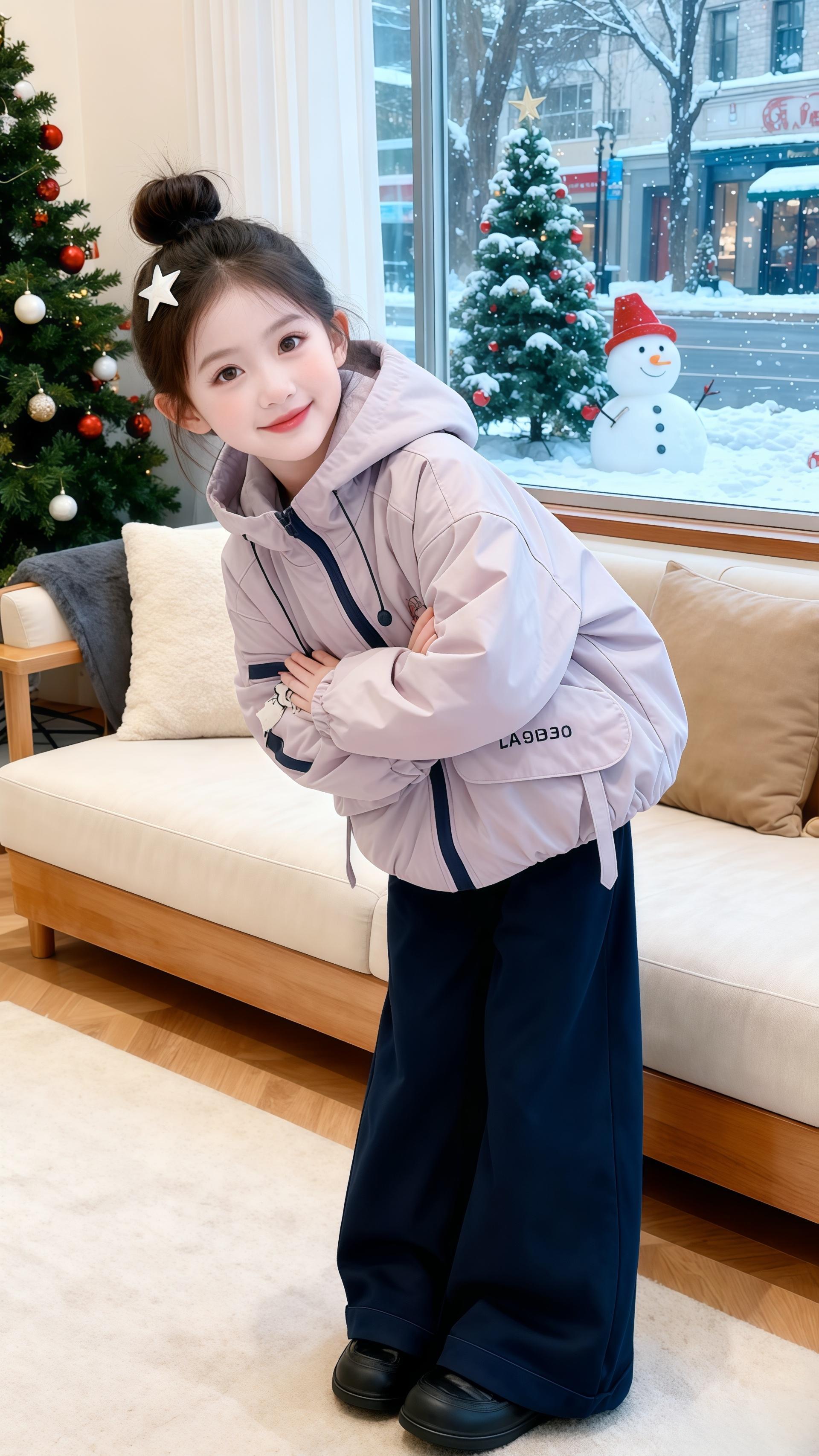 灰紫外套飒爽利落,阔腿裤一搭随性又吸睛。她单手叉腰耍帅,窗外的雪人和圣诞树衬着她,星星发夹闪呀闪。“穿上它,我要在雪地里跑成风,让冬天都跟着变带感!”