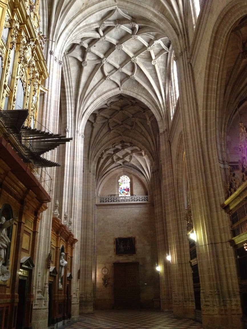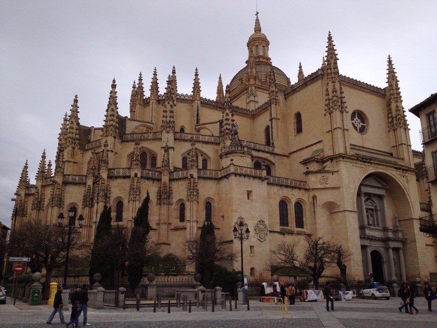 塞戈维亚主教堂,建于16世纪(1525年到1577年),罗马天主教堂,西班牙主要信奉的是天主教(包括大部分西班牙语的拉美国家)。作为日耳曼人分支的西哥特人,占领伊比利亚半岛后,皈依了天主教,所以典型的哥特式建筑。高耸的尖塔、尖拱、尖券等元素,墙体线条垂直,立面装饰精雕细琢。内部采用肋拱设计,形成骨架结构体系,墙壁可镶嵌大玻璃窗。包括科隆大教堂等这类哥特式教堂,都是外观高峭挺拔而富丽华美,运用尖券、尖拱等技术,营造出空灵的意境和上升的形态,诠释基督教精神内涵。