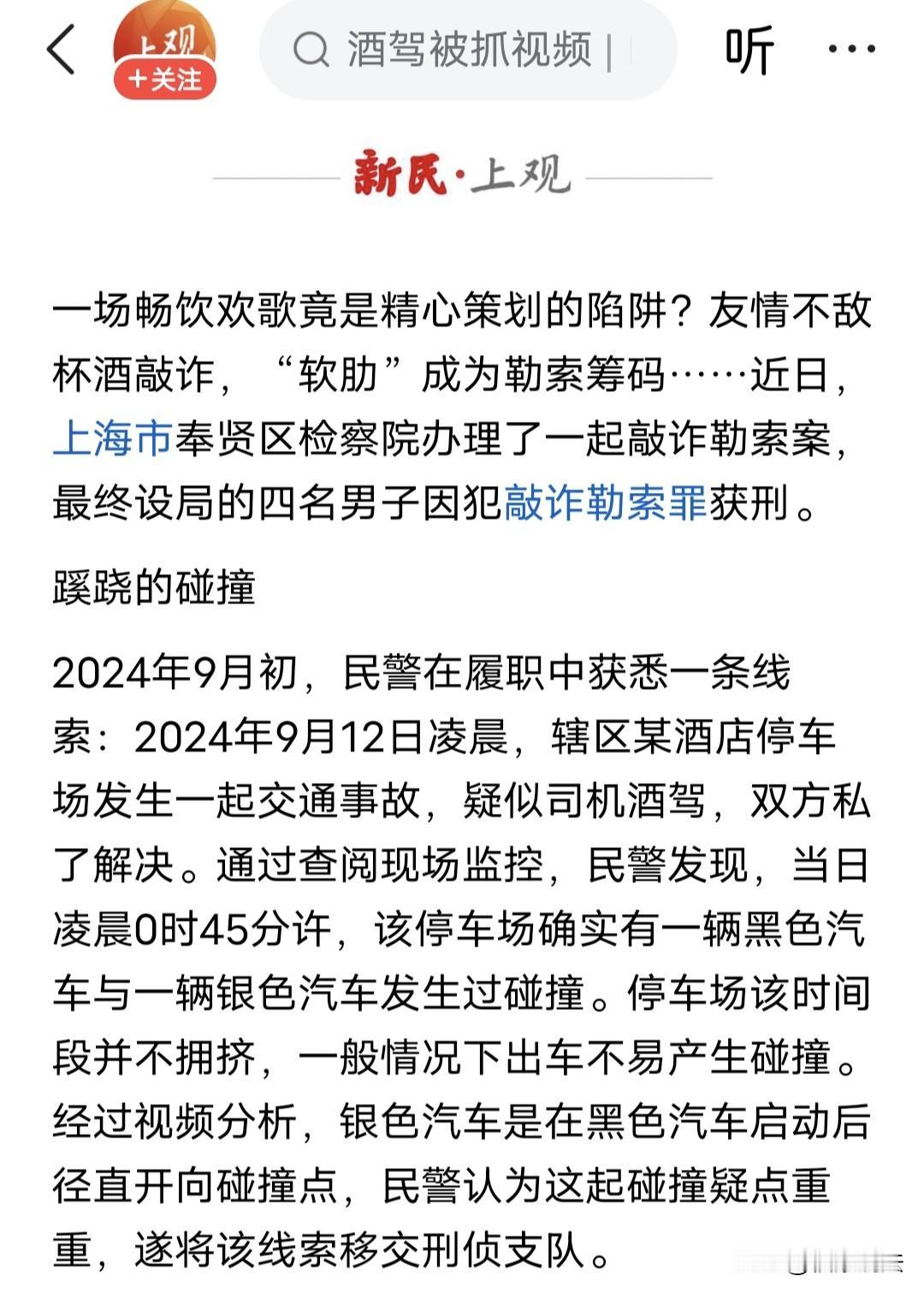 上海,男子受2个好友邀请,参加聚会,酒足饭饱后,男子要叫代驾回家,2好友劝他:凌晨了,交警不会查的。男子听了好友的话,自己开车刚启动开出停车位,不料,一辆银色汽车迎面撞上,车上2人下来指责男子酒驾,扬言要报警,并索赔。男子心虚一想自己正在缓刑期间,只好答应私了,在2好友帮助协商下,赔偿银色汽车13.6万,之后,民警在履职时,发现男子所遇事故并私了,监控视频中情况异常,一查竟是男子的2个好友设下的“鸿门宴”! 2024年9月11号,徐某开着车来到某酒店,因为他的2个好友傅某、唐某邀请他前来聚会。 徐某到了之后,傅某、唐某非常热情招呼他,在聚会上,大家推杯换盏,聊的很畅快,酒足饭饱后,徐某准备叫代驾开车回家。 然而,傅某、唐某却在一旁劝说道:“都已经凌晨了,交警不会查的,你酒量这么好,自己开回去肯定没问题。” 在好友一顿恭维和劝说下,徐某也抱着一丝侥幸心理,决定自己开车回家。 可就在他刚发动车辆,开出停车位时,一辆银色汽车突然迎面驶来,两车狠狠的撞到了一起。 还没等徐某反应过来,银色汽车上下来两个人,气势汹汹的指责徐某酒驾,嚷嚷着要报警,还问他怎么赔? 徐某心慌了,一想到自己还在缓刑期间,报警后可能会前功尽弃,他不敢报警,只能答应对方私了。 在一番协商后,最后,徐某给银色汽车的2人转了13.6万作为赔偿。 事后,徐某以为破财免灾了,可没想到,在同年9月初,民警在日常履职中,发现在9月12号凌晨某酒店停车场发生了一起交通事故,双方私了解决,他们调取监控一看,发现存在异常情况。 监控中显示,凌晨0点45分左右,停车场里,一辆黑色汽车和一辆银色汽车撞一起了,但,当时停车场里并不拥挤,而且,他们发现银色汽车在黑色汽车启动后,径直朝着碰撞点开去,就好像提前设定好了路线。 民警判断这不像意外,背后可能有着不可告人的秘密,于是,他们把该线索移交给了刑侦支队。 民警找到徐某了解了事故的发生经过,随后,又锁定了当晚驾驶银色汽车的2人——张某、马某。 经过一番调查,一个让人瞠目结舌的真相显露出来。 原来,傅某和唐某手头缺钱,生活青黄不接,开始动了歪心思,他们想起之前和徐某借钱被拒的事,就又想了一个“捞钱”的计划。 于是,在9月初,傅某和唐某找到了张某、马某,4人到一起商量,制定了一个周密的计划。 按照计划,傅某和唐某负责把徐某叫出来喝酒,并且在酒桌上忽悠他酒驾,因为他们知道徐某正处于缓刑期间,最怕出事。 而后由张某、马某开着银色汽车,提前等在徐某的黑车附近,等待机会制造交通事故。 这样出了事故,徐某肯定会有所顾忌,一旦酒驾被曝光,他将会面临更严重的法律后果,所以,断定徐某必然不敢报警。 利用徐某这一心理弱点,他们打算以“修车款”为由,向徐某索要巨额赔偿。 9月11日晚,一切按计划进行,唐某将徐某约到KTV喝酒唱歌,这期间,傅某趁机偷偷通知马某和张某驾车等候在徐某车辆附近。 次日凌晨1点多,徐某酒后开车离开KTV,就在他刚启动不久,马某、张某开车故意撞向徐某的车辆。 事故发生后,张某、马某以修车款为由,向徐某索要30万元。 这时讽刺的一幕发生了,唐某、傅某虚情假意的帮徐某和马某、张某协商,还劝他们两方都不要报警。 徐某害怕影响这事影响到自己缓刑考验期,便妥协同意私了,给张某、马某转了13.6万。 事后,傅某等4人到一起分钱,唐某分了8万,傅某分了3万,马某、张某一人1.3万。 徐某此后才恍然大悟,要不是民警细心,自己可能被所谓的朋友坑走了13.6万,而朋友精心设计的这场“鸿门宴”,就是趁虚而入,目的就是骗他的钱财。 正所谓防人之心不可无,徐某轻信了好友的奉承和恭维,一时抱有侥幸心理,酒后驾车,主动将“把柄”交到对方手中,最后,损失了钱财。 2024年9月30日,张某、马某、傅某、唐某4人被抓获归案,之后,4人对自己的犯罪行为供认不讳。 《刑法》第274条规定:敲诈勒索公私财物,数额较大或者多次敲诈勒索的,数额巨大或者有其他严重情节的,处三年以上十年以下有期徒刑,并处罚金。 唐某、傅某、马某、张某四人以非法占有为目的,利用徐某酒驾不敢报警的心理,故意制造交通事故进行敲诈勒索,获取钱财13.6万元,数额巨大,符合敲诈勒索罪的构成要件。 最终,法院判决:以敲诈勒索罪,判处唐某有期徒刑3年7个月,并处罚金25000元; 判处傅某有期徒刑3年2个月,并处罚金20000元。 判处马某有期徒刑2年10个月,并处罚金10000元。 因张某此前犯参加黑 社 会组织罪,还有未执行完的处罚,因此法院判决合并有期徒刑2年8个月,剥夺政 治权利1年2个月19日,处罚金10000元。 关注@福康说法 从日常点滴学法律,生活安稳更有底