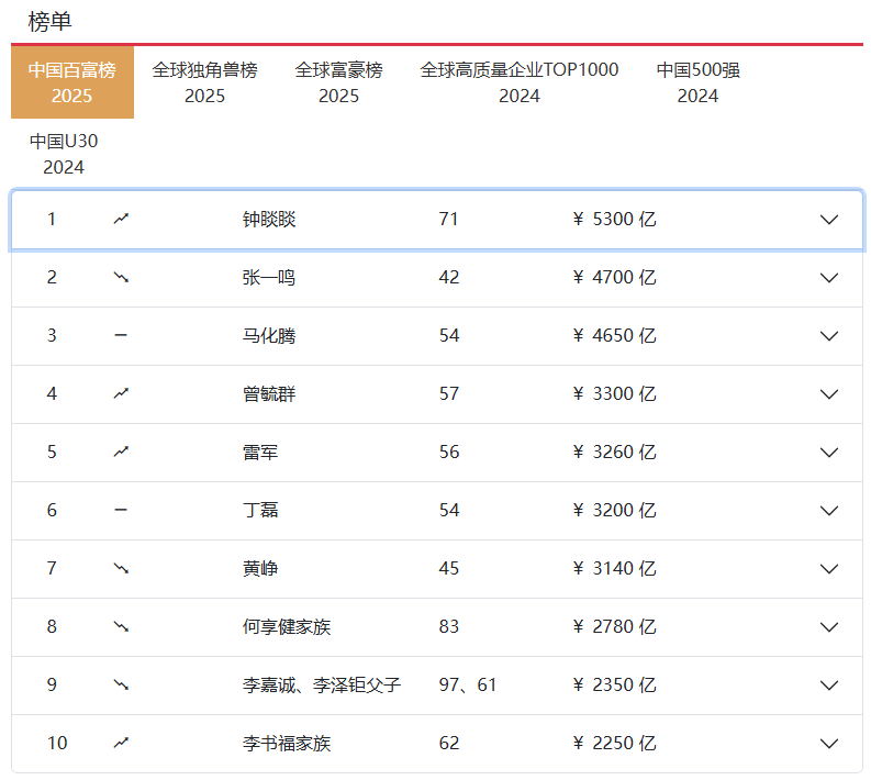 10月28日,胡润研究院发布2025胡润百富榜,钟睒睒财富增长1900亿元,以5300亿元第四次成为中国首富,并刷新了中国首富的财富纪录。