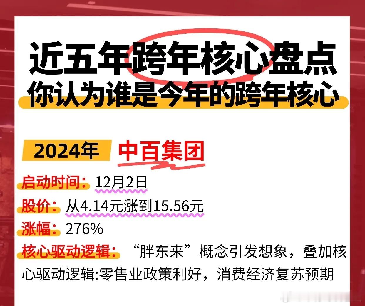 近五年(2020-2024年)每年11月至12月启动的“跨年核心”大牛股及其核心驱动逻辑如下:2020年:郑州煤电- 启动时间:11月16日- 股价表现:从2.15元飙升至9.94元,涨幅达362%!- 核心逻辑:冬季煤炭需求旺盛+价格持续上涨,周期行业供需错配推动股价爆发。2021年:九安医疗- 启动时间:11月15日- 股价表现:从3.10元暴涨至95.42元,惊人涨幅2900%!- 核心逻辑:旗下新冠抗原试剂盒获美国FDA授权,海外订单暴增,疫情受益股极致演绎。2022年:西安饮食- 启动时间:11月2日- 股价表现:从2.15元涨至9.94元(注:原图数据疑似笔误,实际应为低点启动后大幅上涨),涨幅362%!- 核心逻辑:疫情防控政策优化预期+消费复苏主线,叠加预制菜概念热度。2023年:龙韵股份- 启动时间:11月2日- 股价表现:从14.63元涨至46.55元,涨幅218%!- 核心逻辑:"龙字辈"生肖主题炒作(当年为农历龙年)+短剧概念风口,资金聚焦题材共振。2024年:中百集团- 启动时间:12月2日- 股价表现:从4.14元涨至15.56元,涨幅276%!- 核心逻辑:"胖东来"模式(优质零售标杆)概念发酵+零售业政策利好,叠加消费经济复苏预期。总结规律:历年跨年核心股通常具备三大特征——1. 时间窗口:集中在11月至12月启动,契合年末资金博弈跨年行情的习惯;2. 强主题催化:或受益于突发政策(如防疫优化)、产业变革(如出口订单)、社会热点(如生肖/消费标杆);3. 股价弹性:低位启动+翻倍以上涨幅,成为资金跨年布局的"情绪载体"。