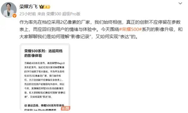 【荣耀500全系搭载骁龙8系旗舰芯片 支持2亿人像实况】荣耀官方公布了荣耀500