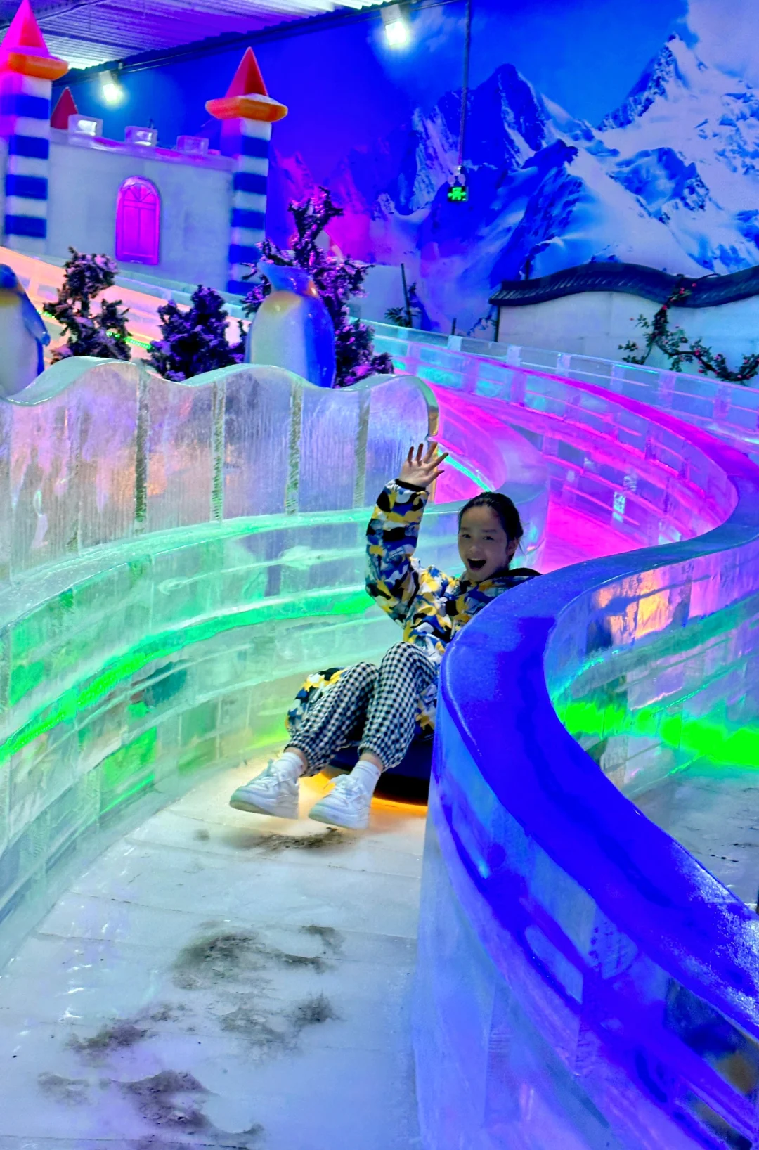 里面构建了一个迷你冰雪世界,除了可以玩冰雪滑道,还能与小企鹅们亲密接触