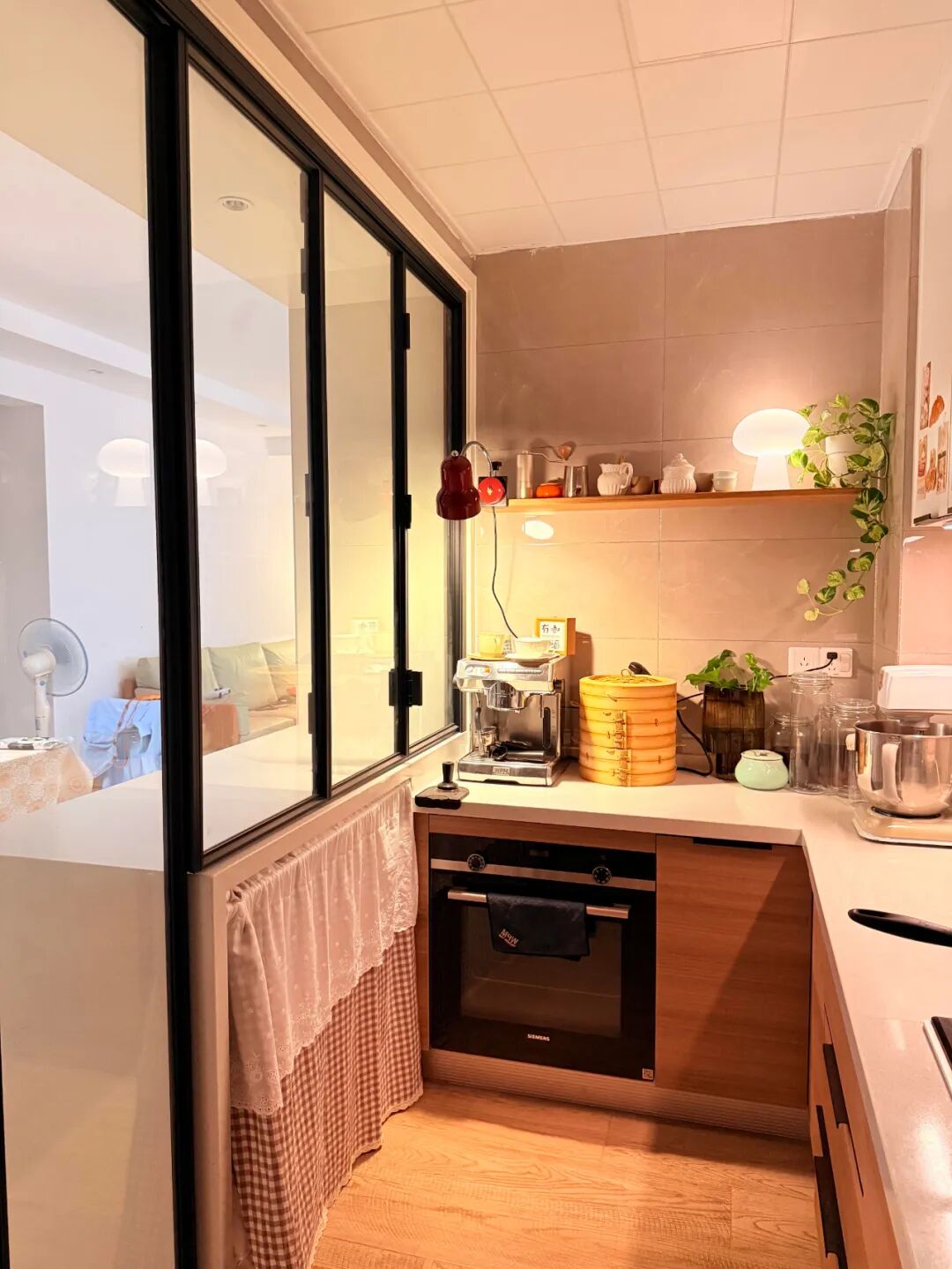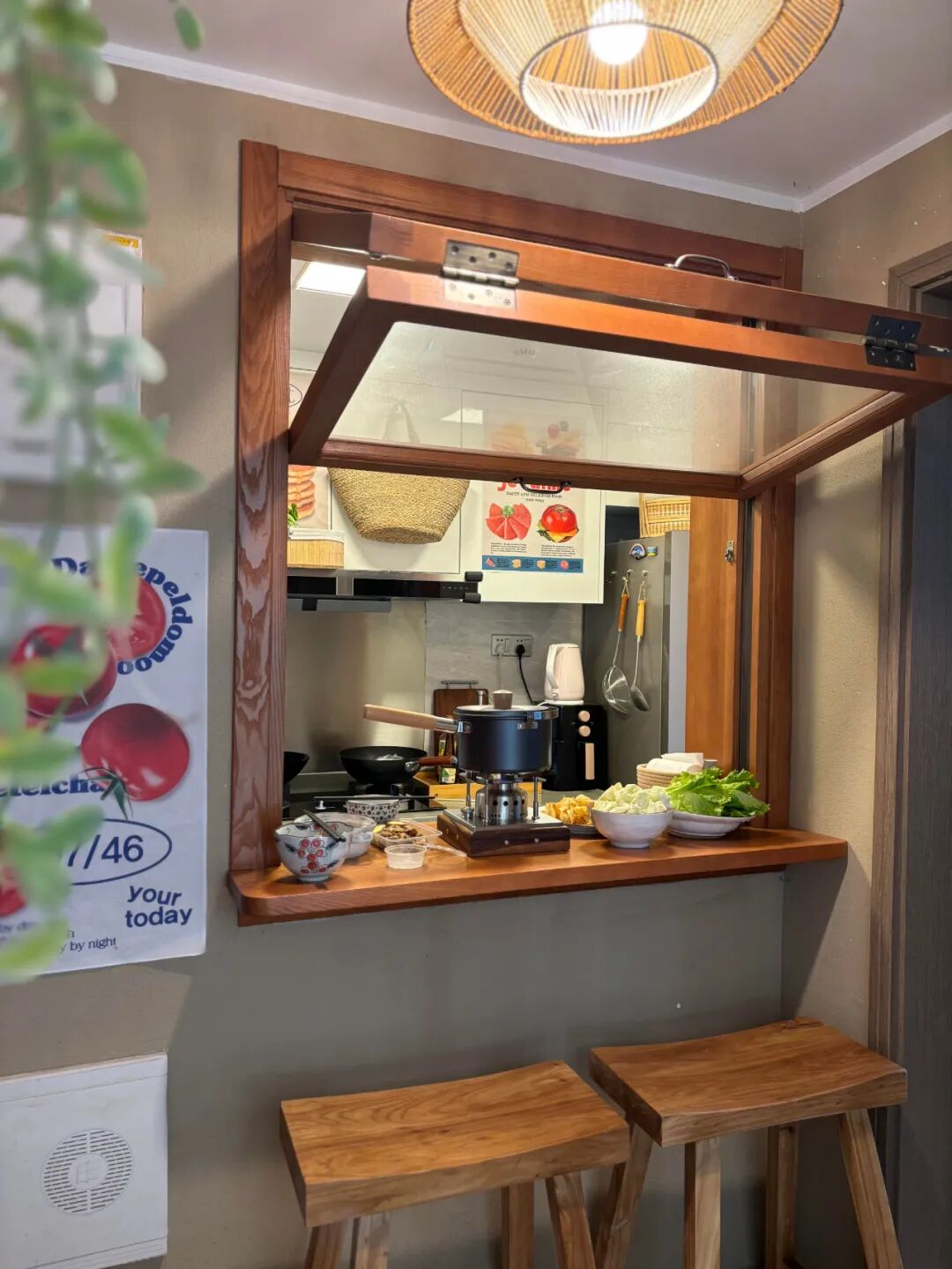 不是拆整面墙,而是在非承重墙上开一扇室内窗。做饭时能递菜传话,光线还能透进去,吧台一搭,情调瞬间拉满。