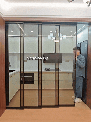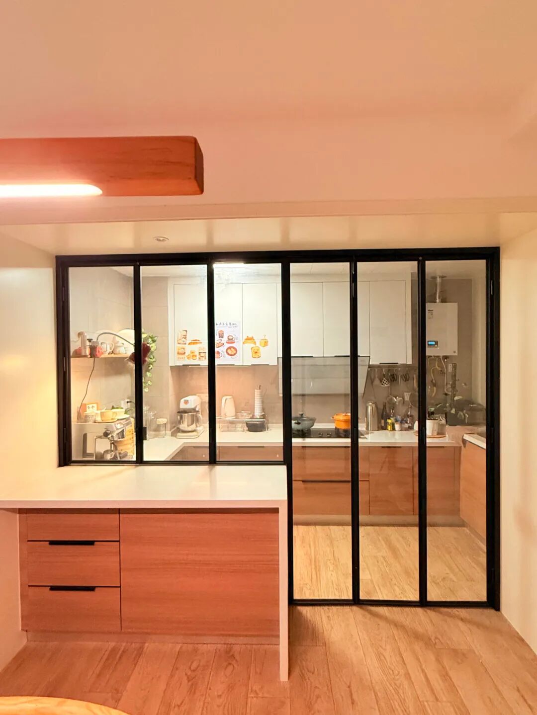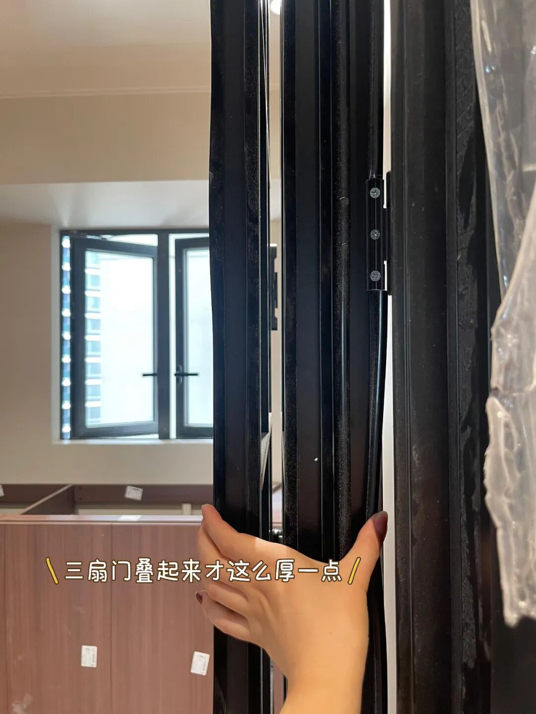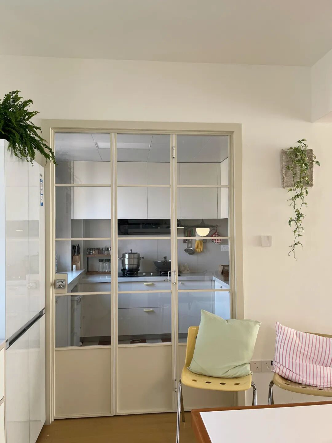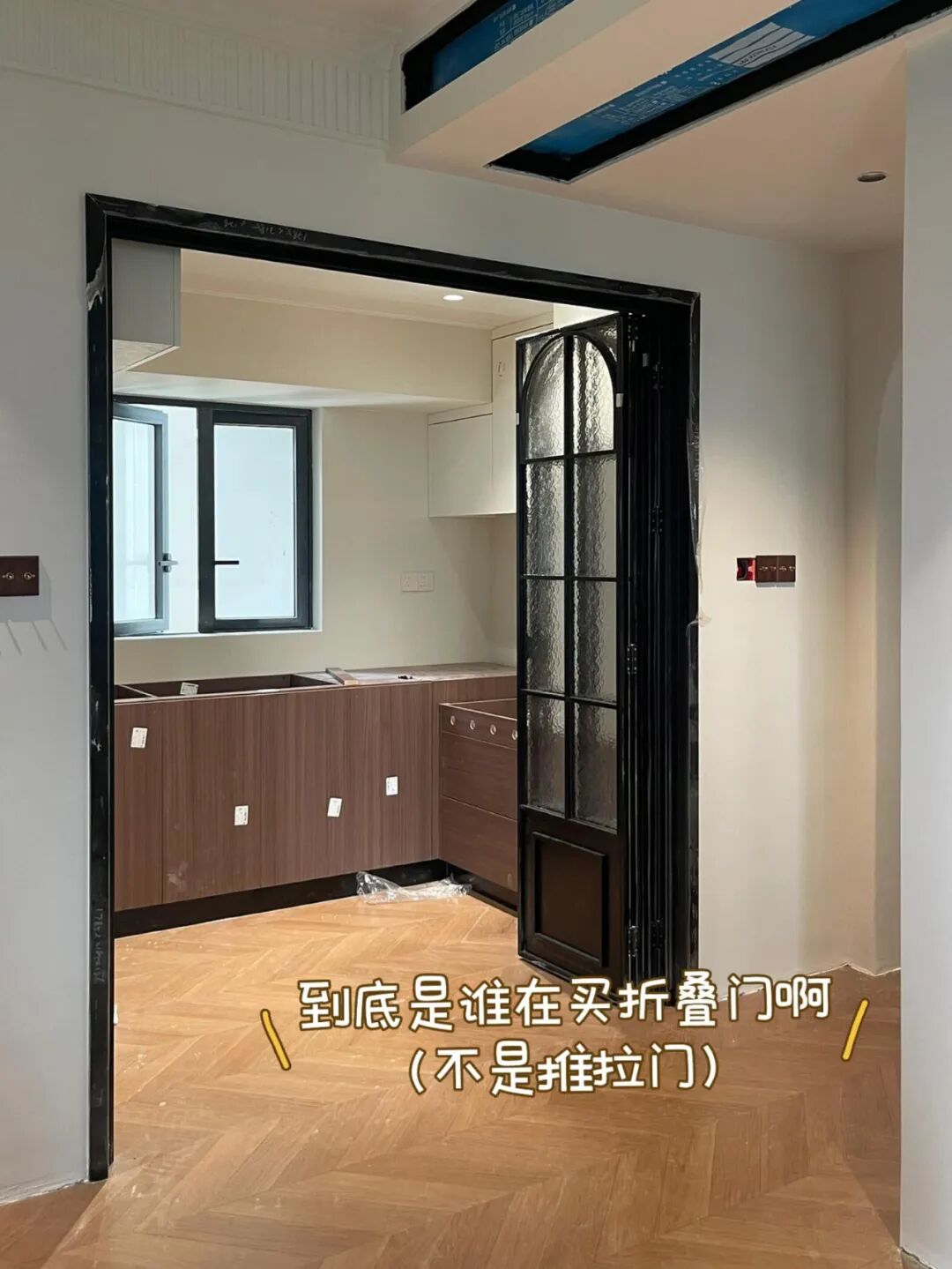 装修时纠结了很久,最终选了三折折叠玻璃门,真的选对了。炒菜时关上,油烟锁得死死的,再也不担心客餐厅有油烟了。