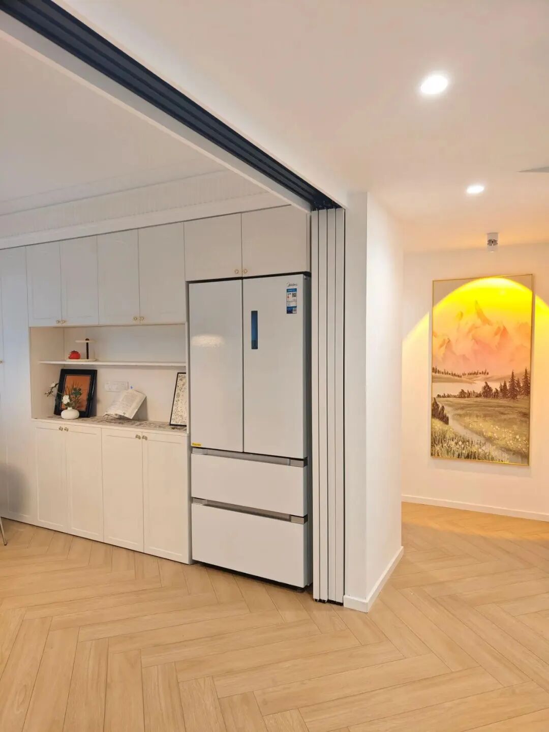 网友@琑琑(suosuo)家,就是这样做的,她家没有选择做传统的推拉门,而是在餐厅位置装这样一组4+0吊轨口袋门,需要时有门,不需要时推开,尽显通透,尤其是38º的盛夏,在厨房做饭太热了,可以打开门,客厅开空调配一个循环扇,对着厨房吹,真的凉快,做饭舒服多了。
