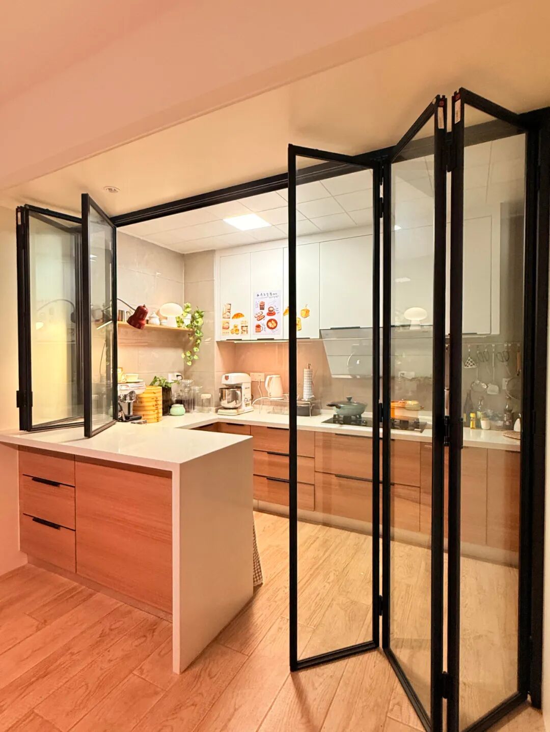 可以做全折叠门,也可以做吧台搭配折叠窗和折叠门,做饭时关上门窗隔绝油烟,平时打开,家人互动也不耽误。