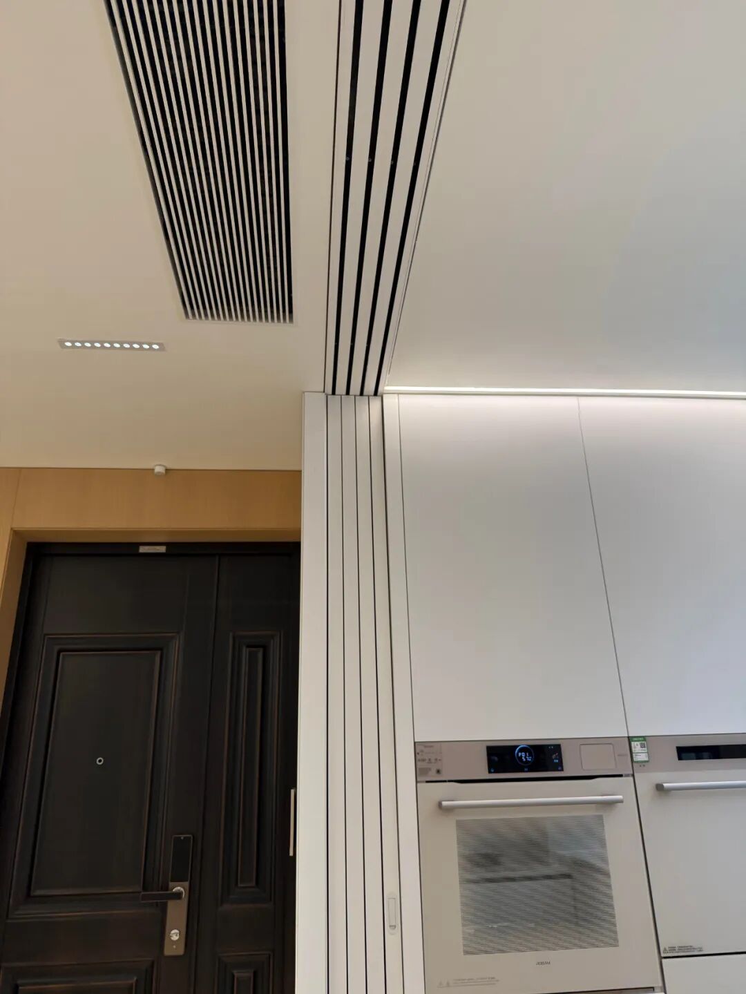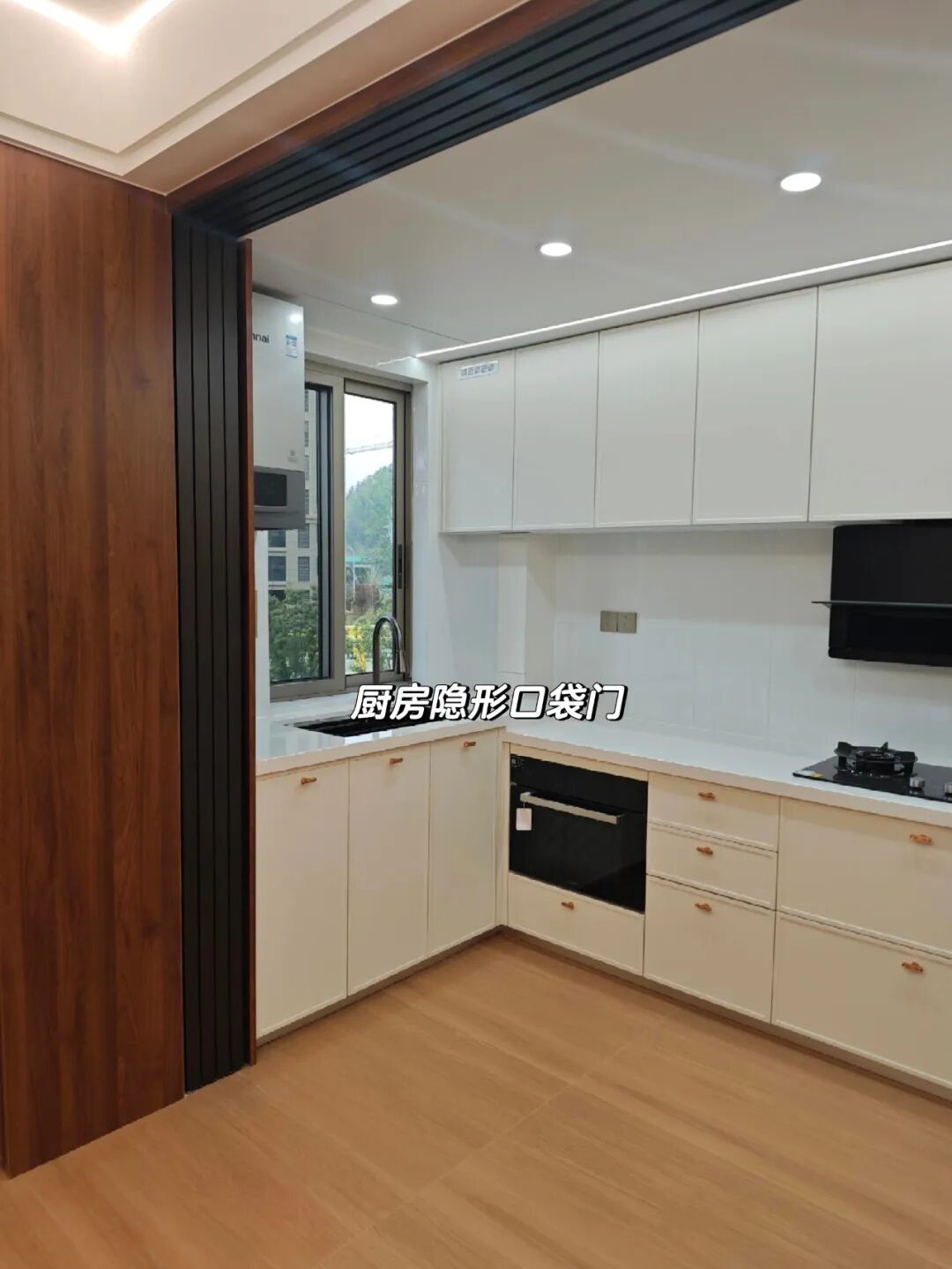 这种口袋门,需要时拉开,隔离油烟和空间,不需要时收起,不注意看吊顶完全发现不了有一道玻璃门。