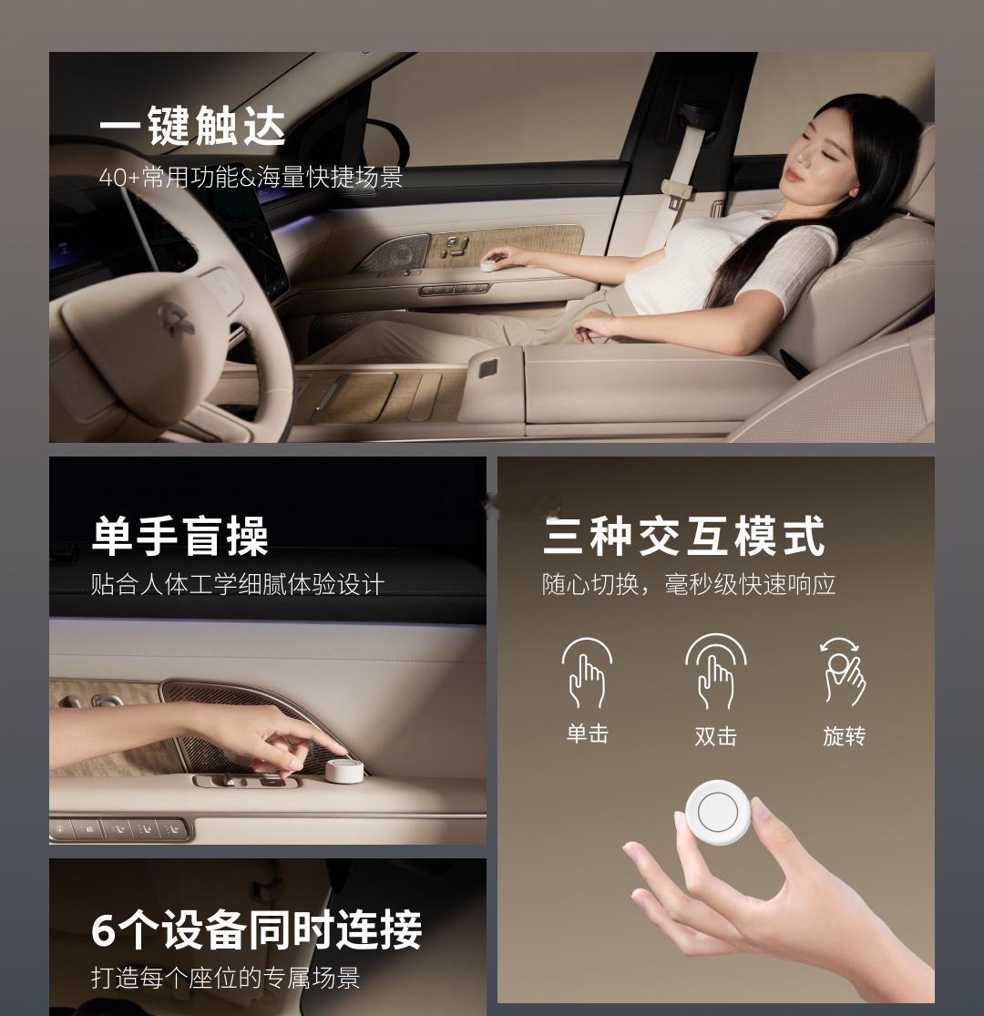 蔚来出了一个实体旋钮可以贴在车内任何地方三种使用模式,单击按压/双击按压/旋转每一种模式可以设定一个功能,等于一个旋钮可以快捷使用三个功能比如单击设为激活快捷场景,双击设为后视镜折叠,旋钮调节风量或者声音三个常用的功能在一个组合键上还是比较实用的一个车可能粘6个旋钮目前仅支持雪松系统,banyan会在之后ota后支持