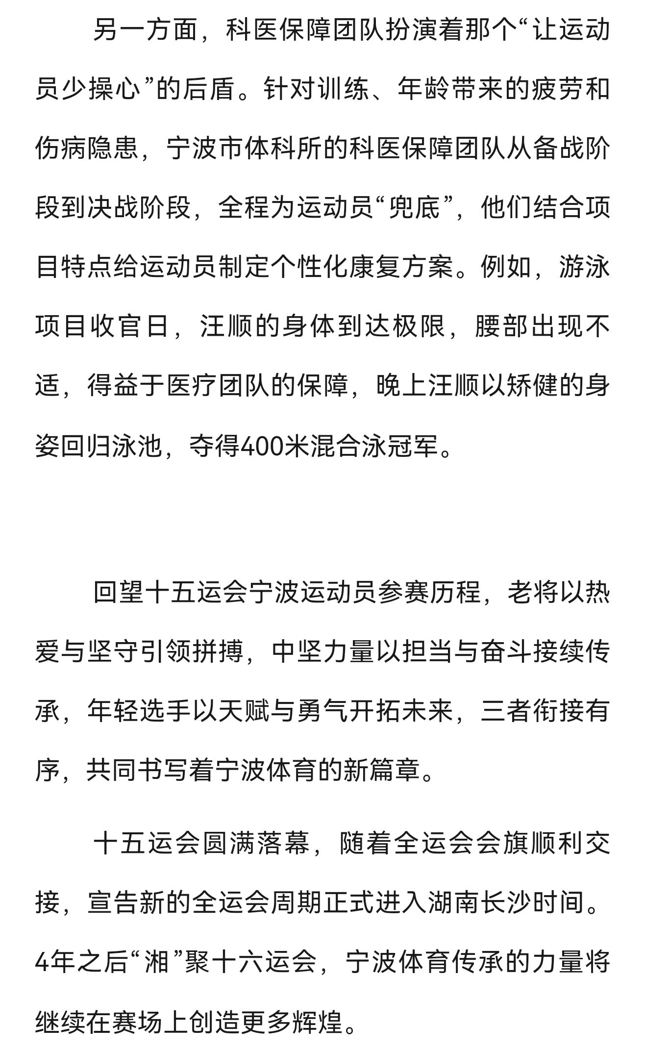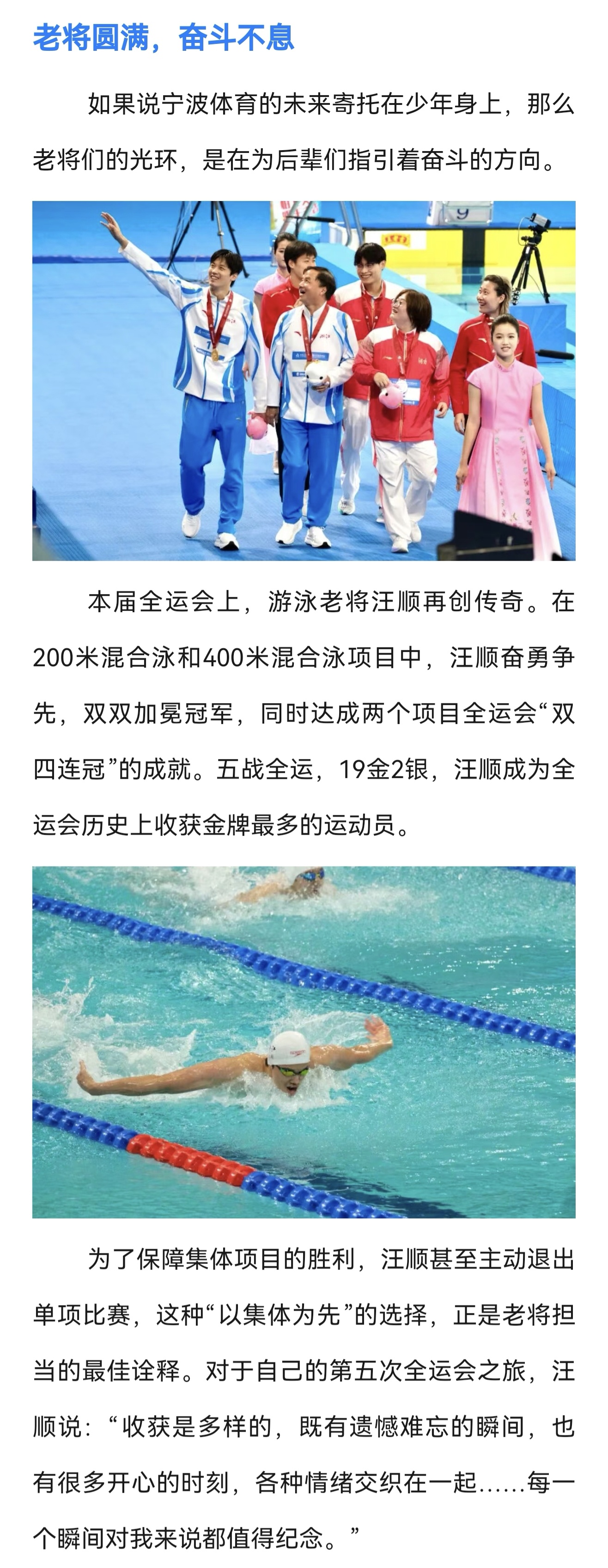 『8451』20251122 深圳十五运会赛后报道「本届全运会上,游泳老将汪顺再创传奇。在200米混合泳和400米混合泳项目中,汪顺奋勇争先,双双加冕冠军,同时达成两个项目全运会“双四连冠”的成就。五战全运,19金2银,汪顺成为全运会历史上收获金牌最多的运动员。为了保障集体项目的胜利,汪顺甚至主动退出单项比赛,这种“以集体为先”的选择,正是老将担当的最佳诠释。对于自己的第五次全运会之旅,汪顺说:“收获是多样的,既有遗憾难忘的瞬间,也有很多开心的时刻,各种情绪交织在一起……每一个瞬间对我来说都值得纪念。”」「另一方面,科医保障团队扮演着那个“让运动员少操心”的后盾。针对训练、年龄带来的疲劳和伤病隐患,宁波市体科所的科医保障团队从备战阶段到决战阶段,全程为运动员“兜底”,他们结合项目特点给运动员制定个性化康复方案。例如,游泳项目收官日,汪顺的身体到达极限,腰部出现不适,得益于医疗团队的保障,晚上汪顺以矫健的身姿回归泳池,夺得400米混合泳冠军。」cr宁波体育